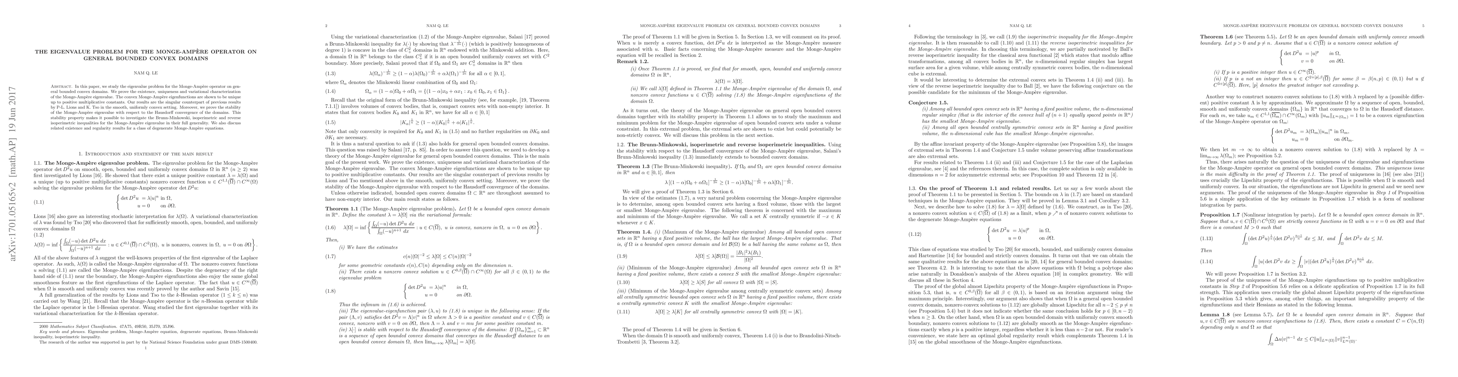 This paper investigates the eigenvalue problem for the Monge-Ampère operator on general bounded convex domains, proving the existence, uniqueness, and variational characterization of the eigenvalue. It also establishes the stability of the eigenvalue under Hausdorff convergence of domains.