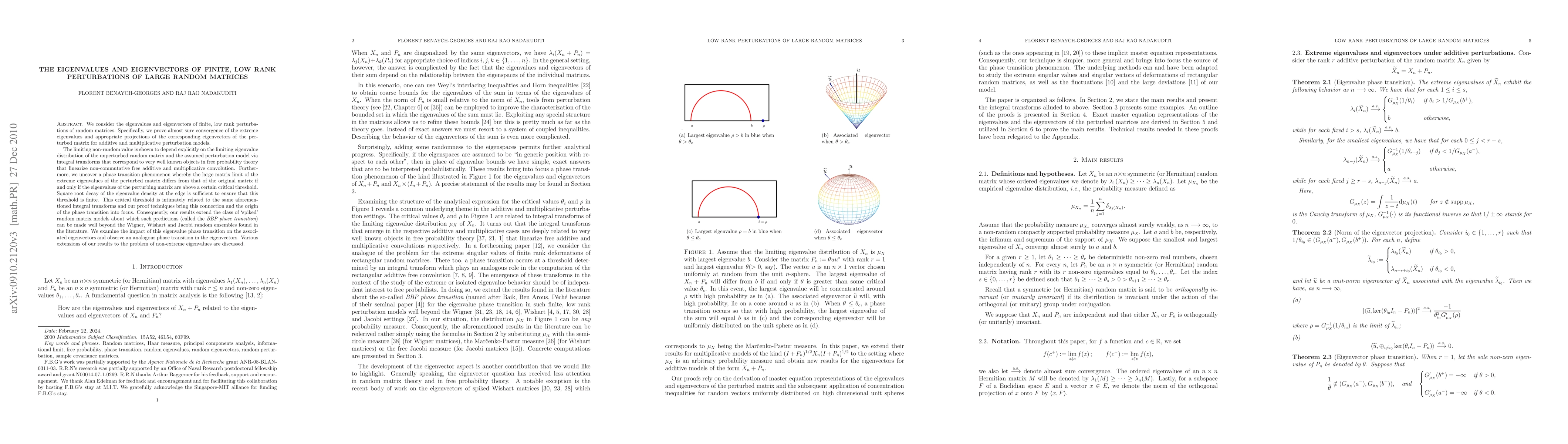 This paper investigates the almost sure convergence of eigenvalues and eigenvectors of finite, low rank perturbations of large random matrices. It uncovers a phase transition where the perturbed matrix's extreme eigenvalues differ from the original matrix's only if the perturbing matrix's eigenvalues exceed a critical threshold, with square root decay of eigenvalue density at the edge ensuring this threshold's finiteness.