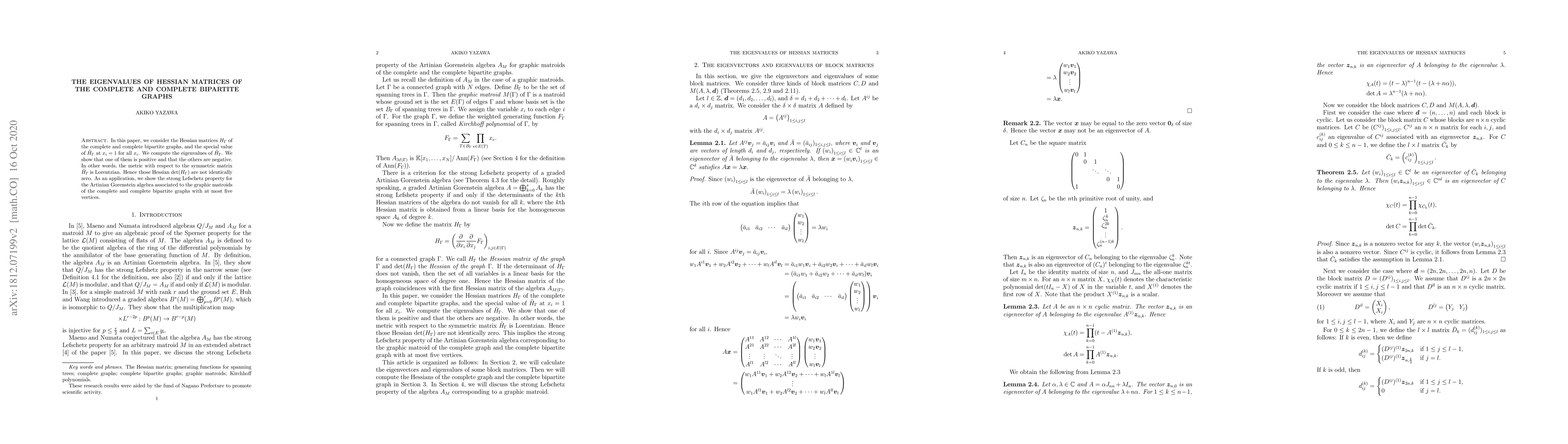 In this paper, we consider the Hessian matrices $H_{\Gamma}$ of the complete and complete bipartite graphs, and the special value of $\tilde H_{\Gamma}$ at $x_{i}=1$ for all $x_{i}$. We compute the eigenvalues of $\tilde H_{\Gamma}$. We show that one of them is positive and that the others are negative. In other words, the metric with respect to the symmetric matrix $\tilde H_{\Gamma}$ is Lorentzian. Hence those Hessian $\det (H_{\Gamma})$ are not identically zero. As an application, we show the strong Lefschetz property for the Artinian Gorenstein algebra associated to the graphic matroids of the complete and complete bipartite graphs with at most five vertices.