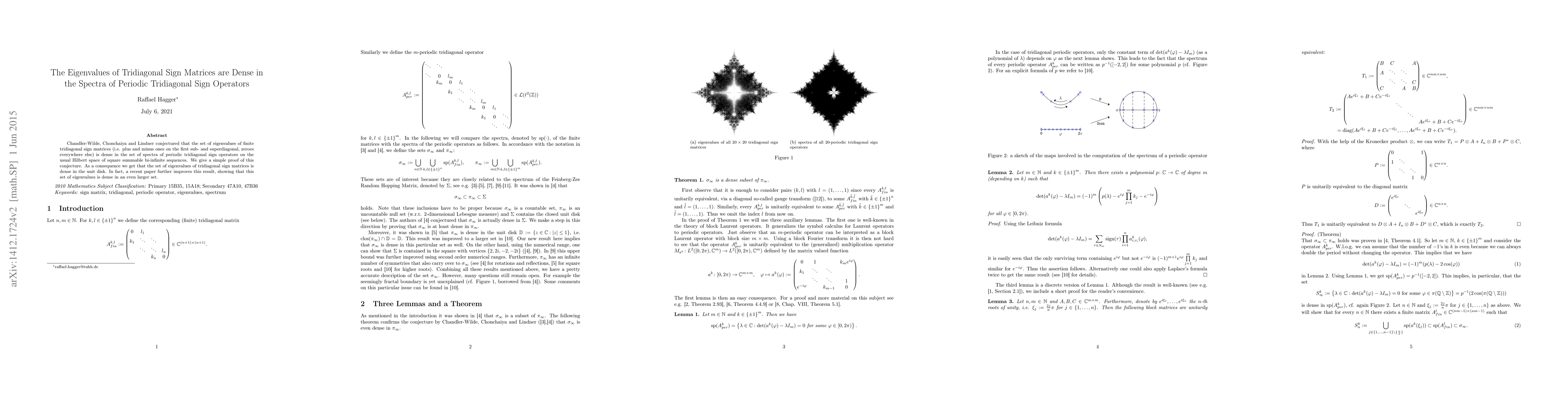 Chandler-Wilde, Chonchaiya and Lindner conjectured that the set of eigenvalues of finite tridiagonal sign matrices ($\pm 1$ on the first sub- and superdiagonal, $0$ everywhere else) is dense in the set of spectra of periodic tridiagonal sign operators on $\ell^2(\mathbb{Z})$. We give a simple proof of this conjecture. As a consequence we get that the set of eigenvalues of tridiagonal sign matrices is dense in the unit disk. In fact, a recent paper further improves this result, showing that this set of eigenvalues is dense in an even larger set.