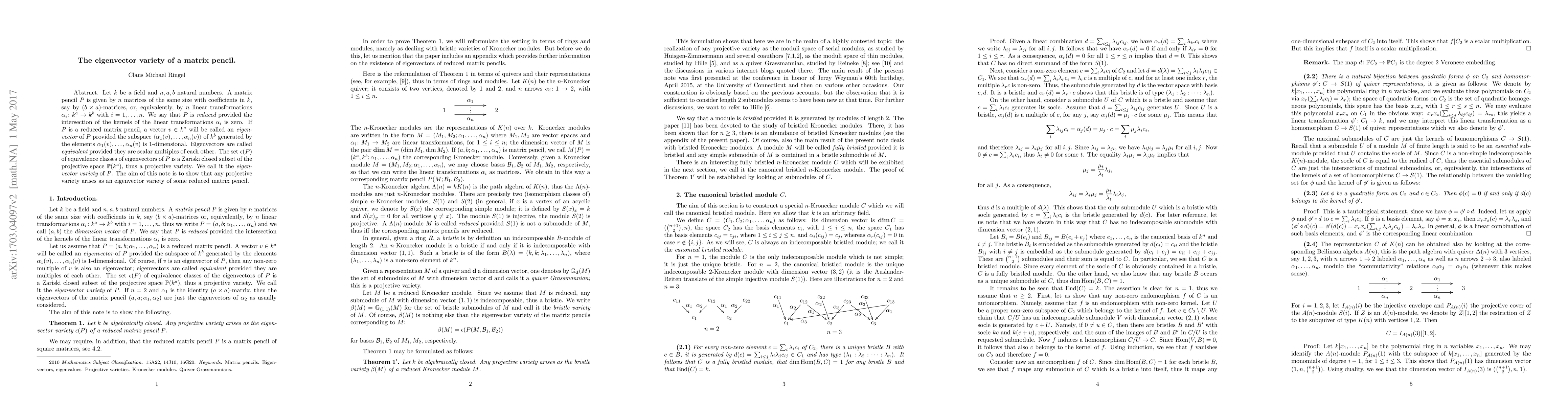 Let $k$ be a field and $n,a,b$ natural numbers. A matrix pencil $P$ is given by $n$ matrices of the same size with coefficients in $k$, say by $(b\times a)$-matrices, or, equivalently, by $n$ linear transformations $\alpha_i\:k^a \to k^b$ with $1=1,\dots,n$. We say that $P$ is reduced provided the intersection of the kernels of the linear transformations $\alpha_i$ is zero. If $P$ is a reduced matrix pencil, a vector $v\in k^a$ will be called an eigenvector of $P$ provided the subspace $\langle \alpha_1(v),\dots,\alpha_n(v) \rangle$ of $k^b$ generated by the elements $\alpha_1(v),\dots,\alpha_n(v)$ is $1$-dimensional. Eigenvectors are called equivalent provided they are scalar multiples of each other. The set $\epsilon(P)$ of equivalence classes of eigenvectors of $P$ is a Zariski closed subset of the projective space $\Bbb P(k^a)$, thus a projective variety. We call it the eigenvector variety of $P$. The aim of this note is to show that any projective variety arises as an eigenvector variety of some reduced matrix pencil.