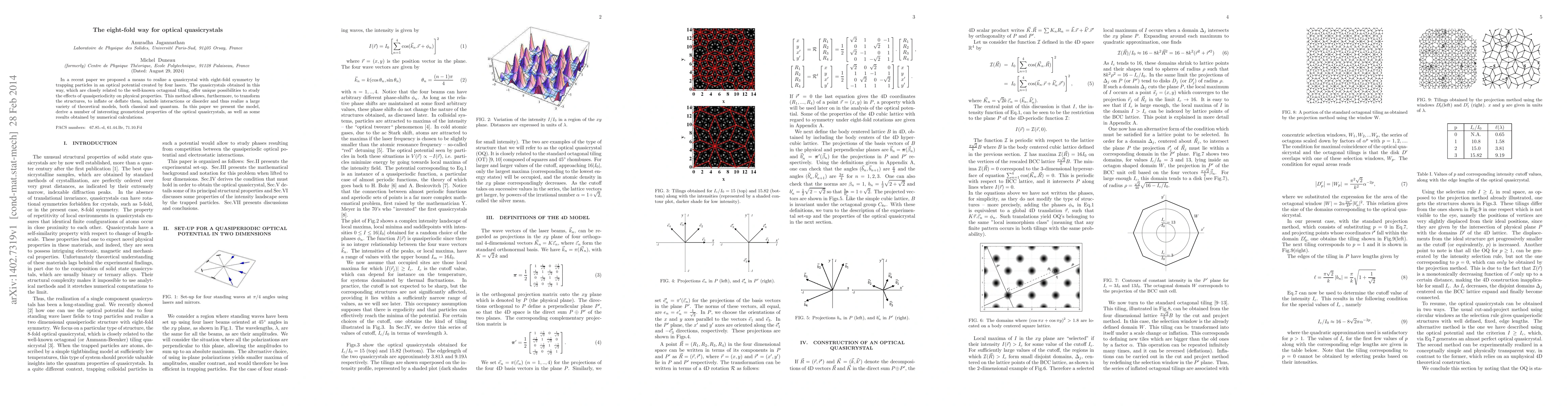 In a recent Letter we proposed a means to realize a quasicrystal with eight-fold symmetry by trapping particles in an optical potential created by four lasers. The quasicrystals obtained in this way, which are closely related to the well-known octagonal tiling, offer unique possibilities to study the effects of quasiperiodicity on physical properties. This method allows to transform the structures, to inflate or deflate them, include interactions or disorder and thus realize a large variety of theoretical models, both classical and quantum. In this paper we derive a number of interesting geometrical properties of the optical quasicrystals, and present some results obtained by numerical calculations.