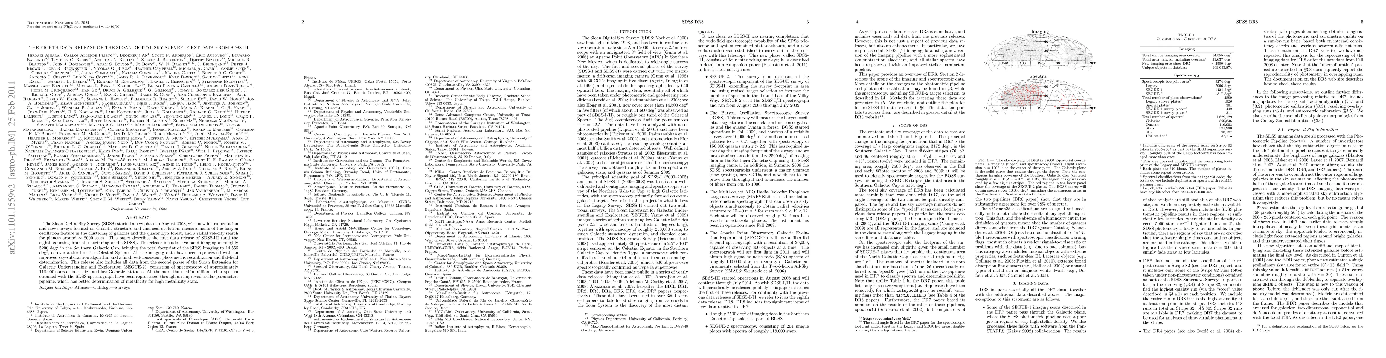 The Sloan Digital Sky Survey (SDSS) released its eighth data set in 2011, marking the first from SDSS-III, which includes new surveys and improved instrumentation. The release features five-band imaging over 5200 deg^2 and reprocessed spectroscopic data for over half a million stars, enhancing metallicity determination.