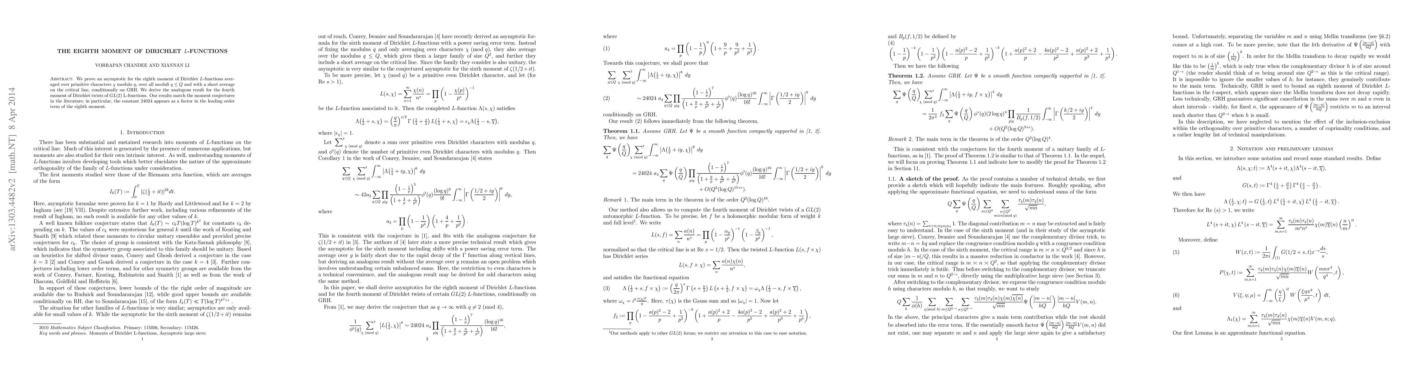 The paper proves an asymptotic for the eighth moment of Dirichlet L-functions, matching a conjecture in the literature and confirming a key constant.