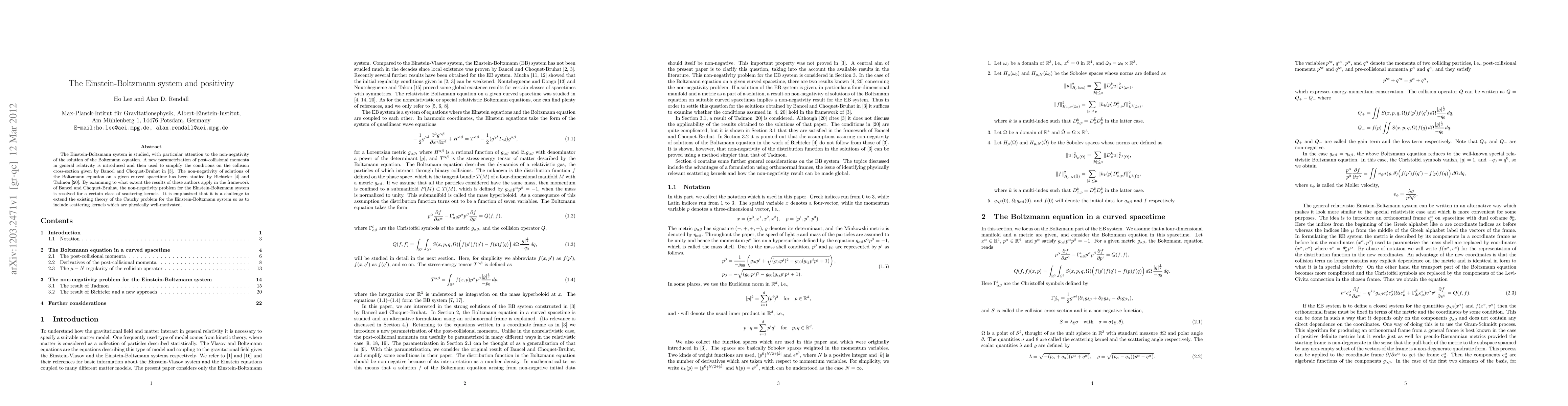 The Einstein-Boltzmann system is studied, with particular attention to the non-negativity of the solution of the Boltzmann equation. A new parametrization of post-collisional momenta in general relativity is introduced and then used to simplify the conditions on the collision cross-section given by Bancel and Choquet-Bruhat. The non-negativity of solutions of the Boltzmann equation on a given curved spacetime has been studied by Bichteler and by Tadmon. By examining to what extent the results of these authors apply in the framework of Bancel and Choquet-Bruhat, the non-negativity problem for the Einstein-Boltzmann system is resolved for a certain class of scattering kernels. It is emphasized that it is a challenge to extend the existing theory of the Cauchy problem for the Einstein-Boltzmann system so as to include scattering kernels which are physically well-motivated.