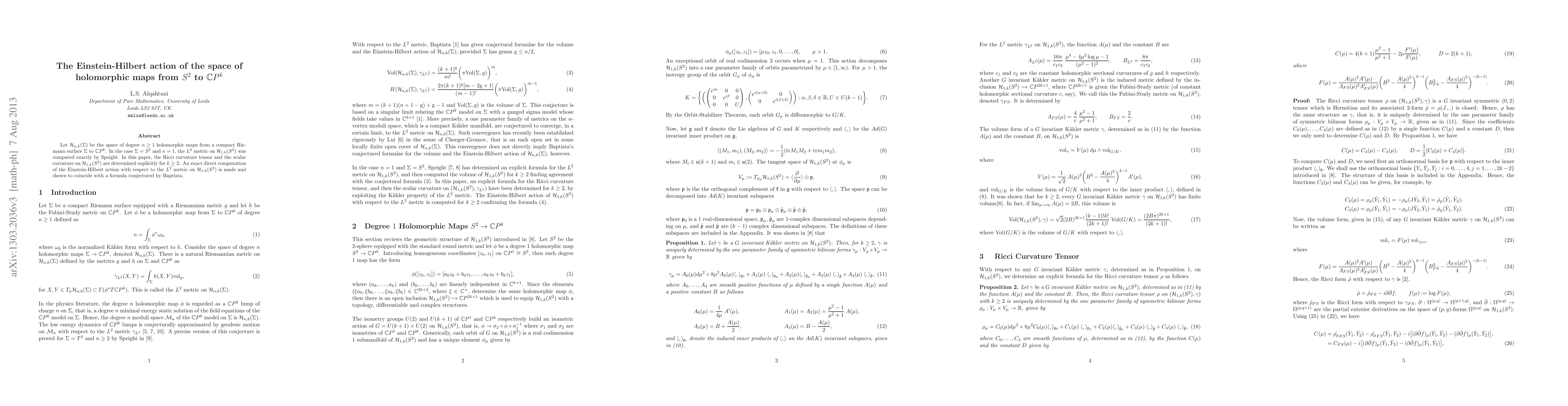 Let $\mathcal{H}_{n,k}(\Sigma)$ be the space of degree $n\geq 1$ holomorphic maps from a compact Riemann surface $\Sigma $ to $\mathbb{C}P^k$. In the case $\Sigma=S^2$ and $n=1$, the $L^2$ metric on $\mathcal{H}_{1,k}(S^2)$ was computed exactly by Speight. In this paper, the Ricci curvature tensor and the scalar curvature on $\mathcal{H}_{1,k}(S^2)$ are determined explicitly for $k\geq 2$. An exact direct computation of the Einstein-Hilbert action with respect to the $L^2$ metric on $\mathcal{H}_{1,k}(S^2)$ is made and shown to coincide with a formula conjectured by Baptista.