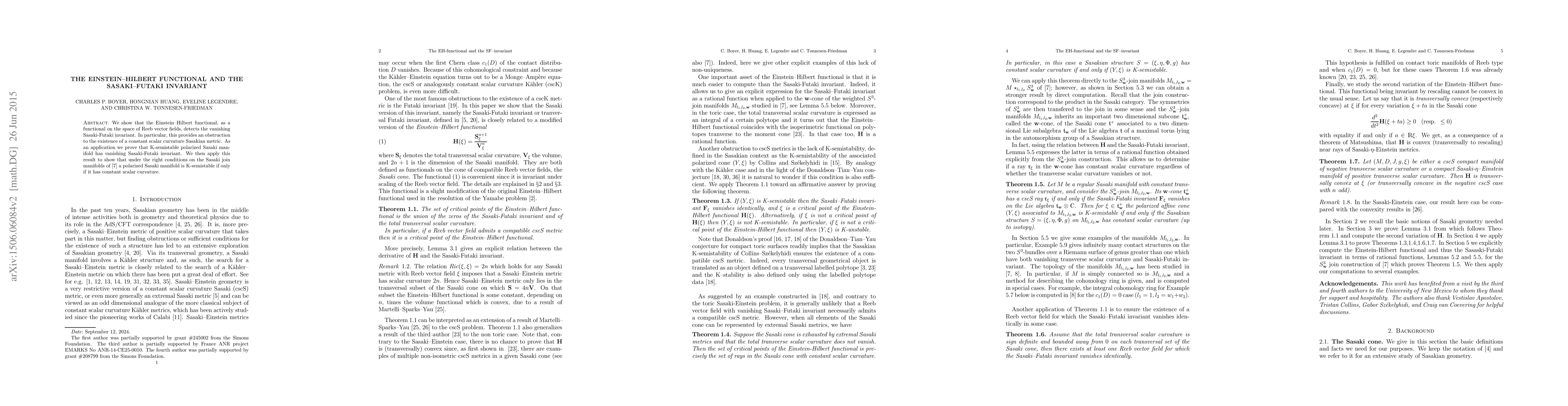 We show that the Einstein-Hilbert functional, as a functional on the space of Reeb vector fields, detects the vanishing Sasaki-Futaki invariant. In particular, this provides an obstruction to the existence of a constant scalar curvature Sasakian metric. As an application we prove that K-semistable polarized Sasaki manifold has vanishing Sasaki-Futaki invariant. We then apply this result to show that under the right conditions on the Sasaki join manifolds of [7] a polarized Sasaki manifold is K-semistable if only if it has constant scalar curvature.