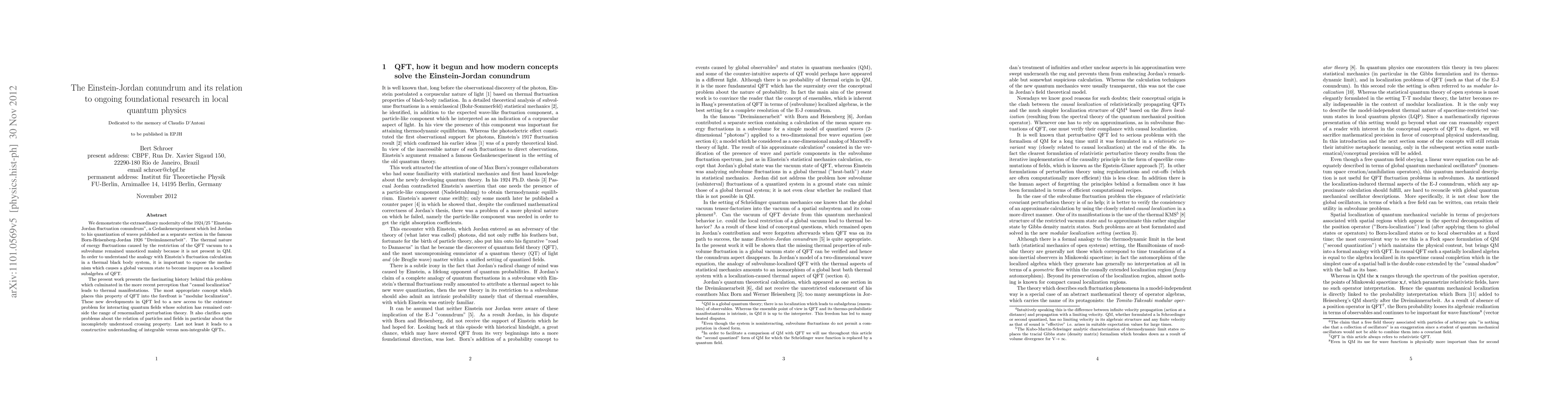 We demonstrate the extraordinary modernity of the 1924/25 "Einstein-Jordan fluctuation conundrum", a Gedankenexperiment which led Jordan to his quantization of waves published as a separate section in the famous Born-Heisenberg-Jordan 1926 "Dreim\"annerarbeit". The thermal nature of energy fluctuations caused by the restriction of the QFT vacuum to a subvolume remained unnoticed mainly because it is not present in QM. In order to understand the analogy with Einstein's fluctuation calculation in a thermal black body system, it is important to expose the mechanism which causes a global vacuum state to become impure on a localized subalgebra of QFT. The present work presents the fascinating history behind this problem which culminated in the more recent perception that "causal localization" leads to thermal manifestations. The most appropriate concept which places this property of QFT into the forefront is "modular localization". These new developments in QFT led to a new access to the existence problem for interacting quantum fields whose solution has remained outside the range of renormalized perturbation theory. It also clarifies open problems about the relation of particles and fields in particular about the incompletely understood crossing property. Last not least it leads to a constructive understanding of integrable versus non-integrable QFTs..