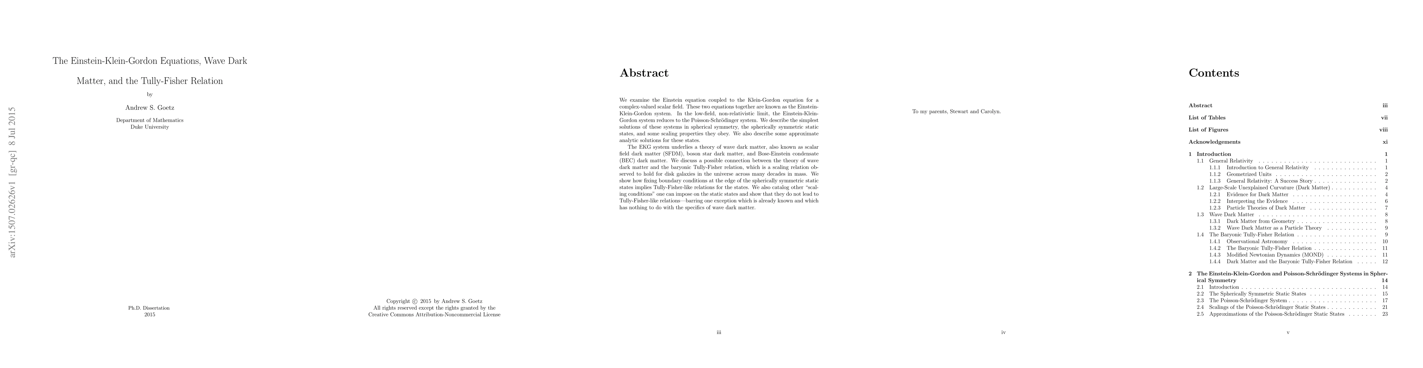 This paper explores the Einstein-Klein-Gordon system and its connection to wave dark matter, demonstrating how spherically symmetric static states can imply Tully-Fisher-like relations for disk galaxies, suggesting a potential link between wave dark matter and observed galactic scaling relations.