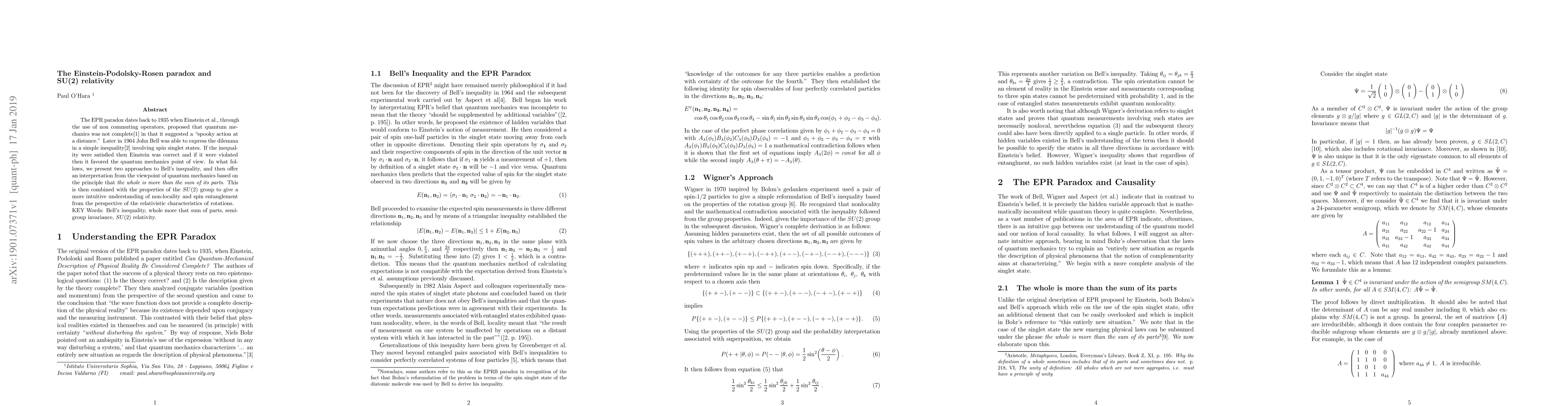 The EPR paradox dates back to 1935 when Einstein et al., through the use of non commuting operators, proposed that quantum mechanics was not complete in that it suggested a `spooky action at a distance.' Later in 1964 John Bell was able to express the dilemma in a simple inequality involving spin-singlet states. If the inequality were satisfied then Einstein was correct and if it were violated then it favored the quantum mechanics point of view. In what follows, we present two approaches to Bell's inequality, and then offer an interpretation from the viewpoint of quantum mechanics based on the principle that the whole is more than the sum of its parts. This is then combined with the properties of the $SU(2)$ group to give a more intuitive understanding of non-locality and spin entanglement from the perspective of the relativistic characteristics of rotations.