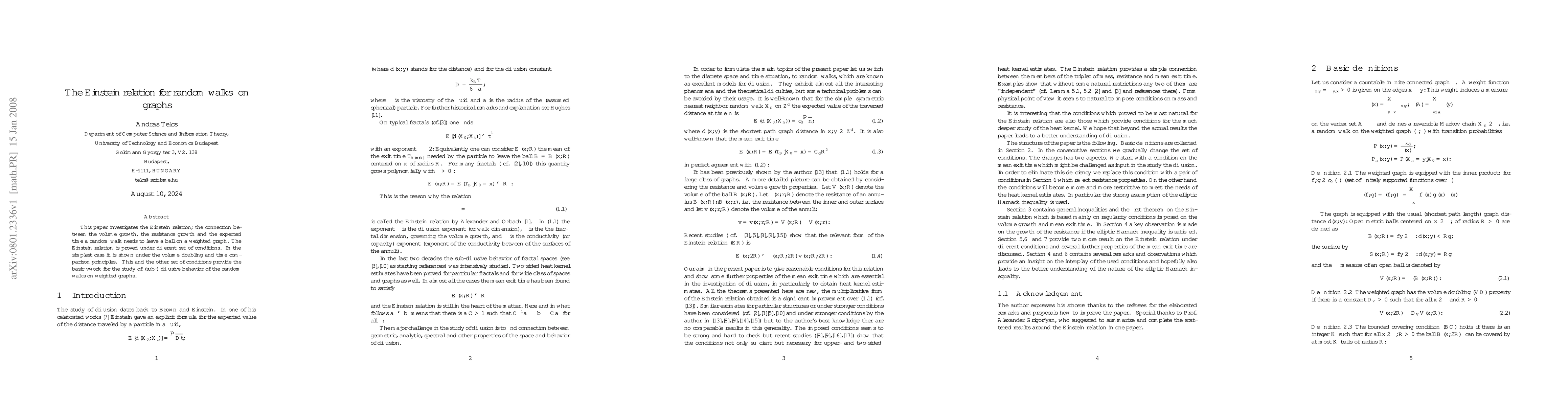 This paper explores the Einstein relation for random walks on weighted graphs, establishing a link between volume growth, resistance growth, and the expected time for random walks to exit a ball. It proves the relation under volume doubling and time comparison principles, providing a foundational framework for studying (sub-)diffusive behaviors on such graphs.