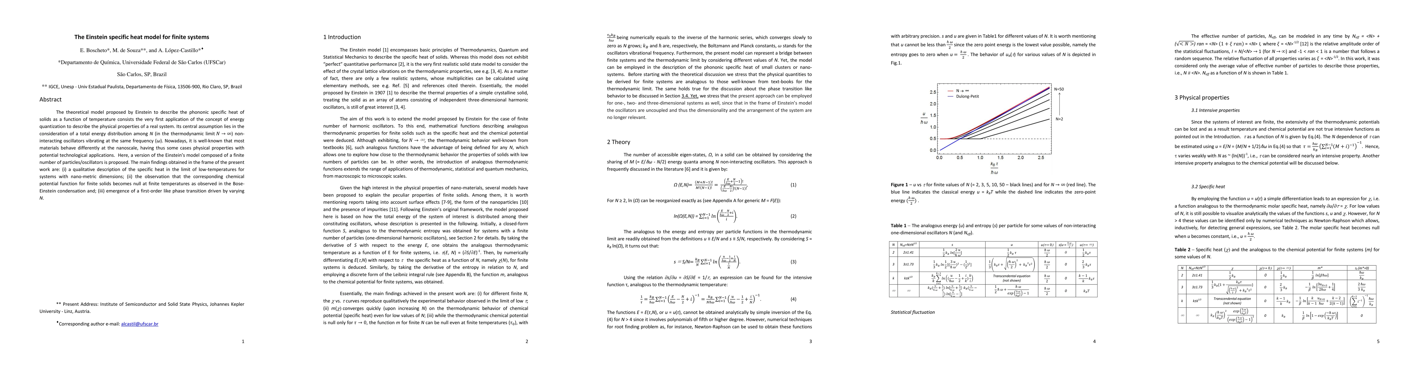 The theoretical model proposed by Einstein to describe the phononic specific heat of solids as a function of temperature consists the very first application of the concept of energy quantization to describe the physical properties of a real system. Its central assumption lies in the consideration of a total energy distribution among N (in the thermodynamic limit $N \rightarrow \infty$) non-interacting oscillators vibrating at the same frequency ($\omega$). Nowadays, it is well-known that most materials behave differently at the nanoscale, having thus some cases physical properties with potential technological applications. Here, a version of the Einstein's model composed of a finite number of particles/oscillators is proposed. The main findings obtained in the frame of the present work are: (i) a qualitative description of the specific heat in the limit of low-temperatures for systems with nano-metric dimensions; (ii) the observation that the corresponding chemical potential function for finite solids becomes null at finite temperatures as observed in the Bose-Einstein condensation and; (iii) emergence of a first-order like phase transition driven by varying $N$.
