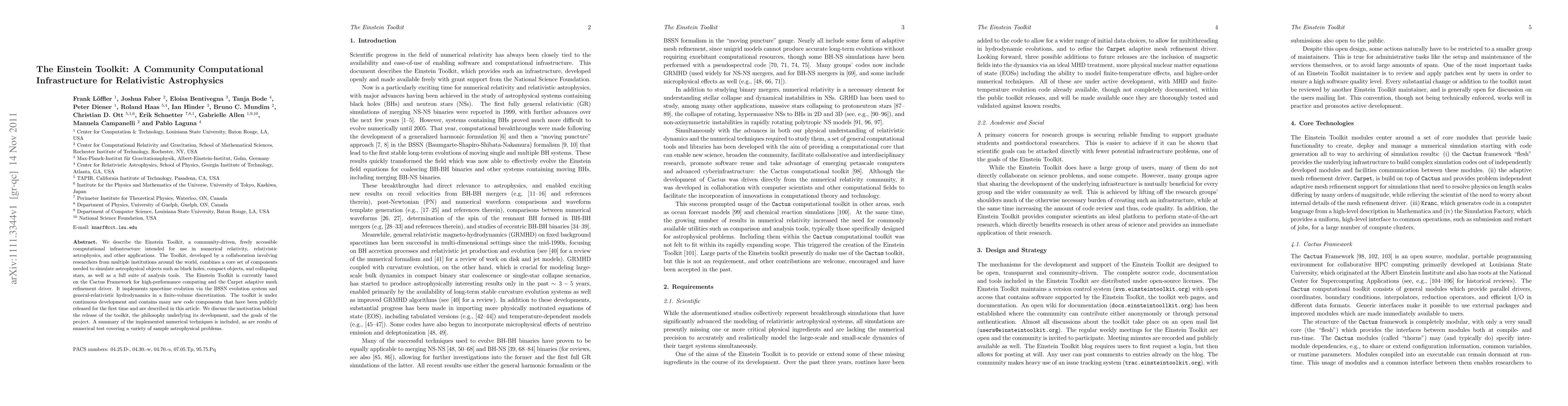 The Einstein Toolkit is a collaborative, open-source computational infrastructure for numerical relativity and relativistic astrophysics, developed to simulate complex astrophysical objects and events. It integrates advanced numerical techniques and is continuously updated with new code components.