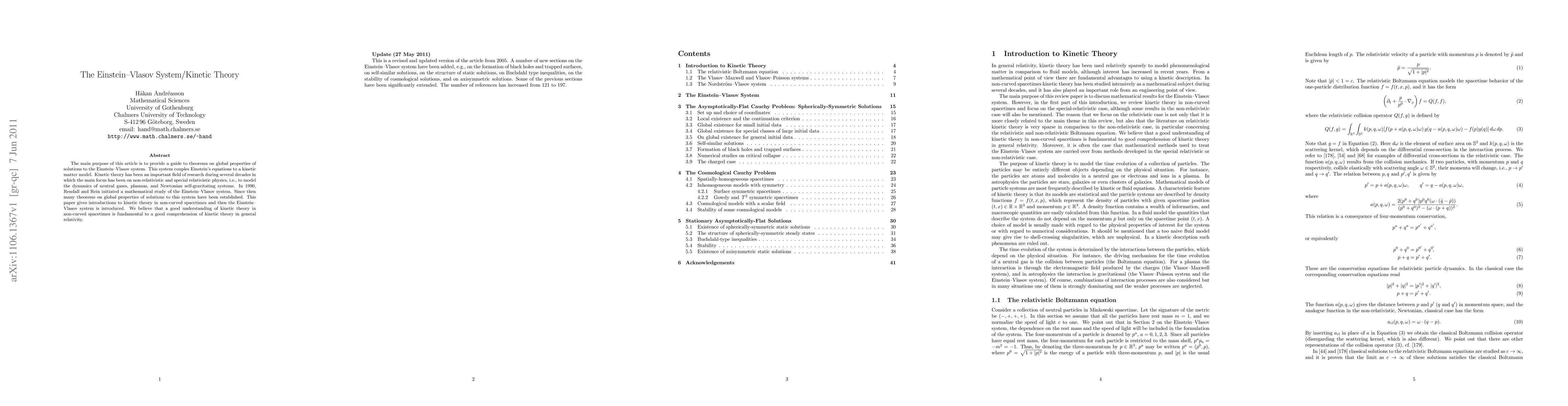 The main purpose of this article is to provide a guide to theorems on global properties of solutions to the Einstein--Vlasov system. This system couples Einstein's equations to a kinetic matter model. Kinetic theory has been an important field of research during several decades in which the main focus has been on non-relativistic and special relativistic physics, i.e., to model the dynamics of neutral gases, plasmas, and Newtonian self-gravitating systems. In 1990, Rendall and Rein initiated a mathematical study of the Einstein--Vlasov system. Since then many theorems on global properties of solutions to this system have been established.