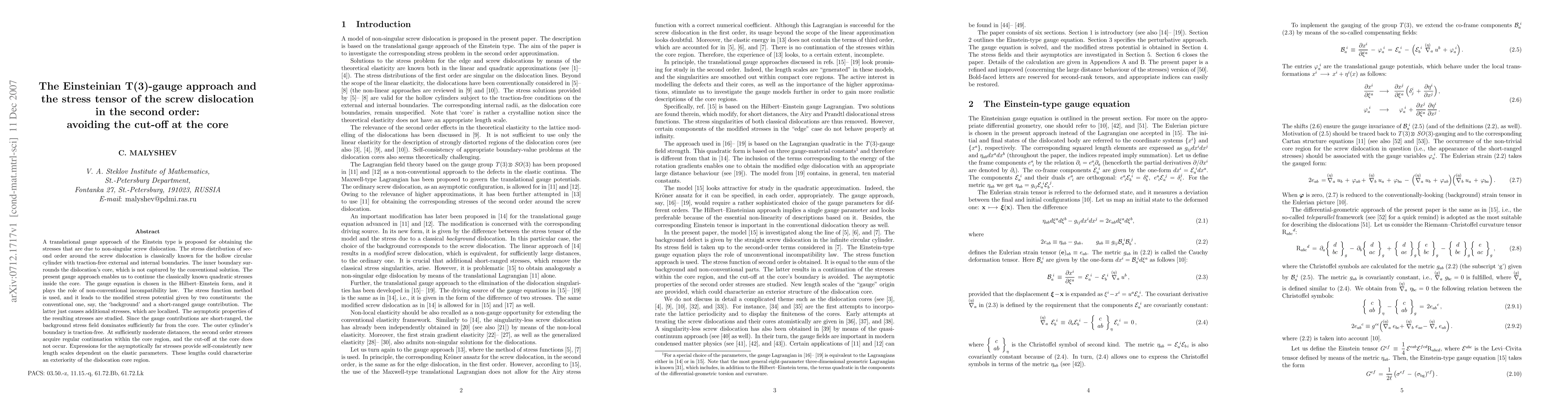 A translational gauge approach of the Einstein type is proposed for obtaining the stresses that are due to non-singular screw dislocation. The stress distribution of second order around the screw dislocation is classically known for the hollow circular cylinder with traction-free external and internal boundaries. The inner boundary surrounds the dislocation's core, which is not captured by the conventional solution. The present gauge approach enables us to continue the classically known quadratic stresses inside the core. The gauge equation is chosen in the Hilbert--Einstein form, and it plays the role of non-conventional incompatibility law. The stress function method is used, and it leads to the modified stress potential given by two constituents: the conventional one, say, the `background' and a short-ranged gauge contribution. The latter just causes additional stresses, which are localized. The asymptotic properties of the resulting stresses are studied. Since the gauge contributions are short-ranged, the background stress field dominates sufficiently far from the core. The outer cylinder's boundary is traction-free. At sufficiently moderate distances, the second order stresses acquire regular continuation within the core region, and the cut-off at the core does not occur. Expressions for the asymptotically far stresses provide self-consistently new length scales dependent on the elastic parameters. These lengths could characterize an exteriority of the dislocation core region.