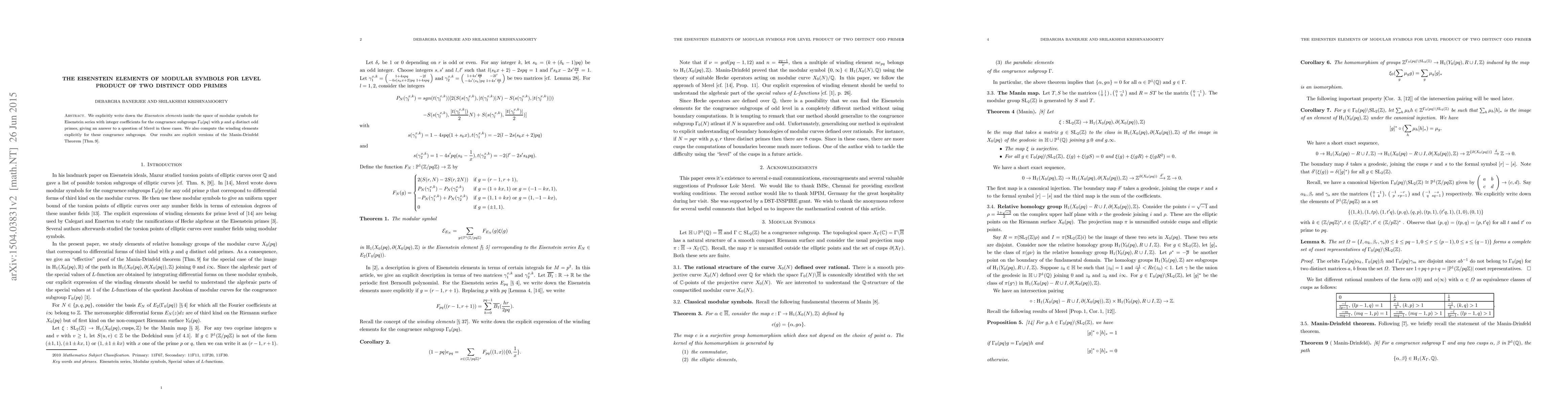 This paper provides explicit expressions for Eisenstein elements within modular symbols for the level product of two distinct odd primes, addressing a question posed by Merel. Additionally, it computes winding elements for the corresponding congruence subgroups, offering explicit versions of the Manin-Drinfeld Theorem.
