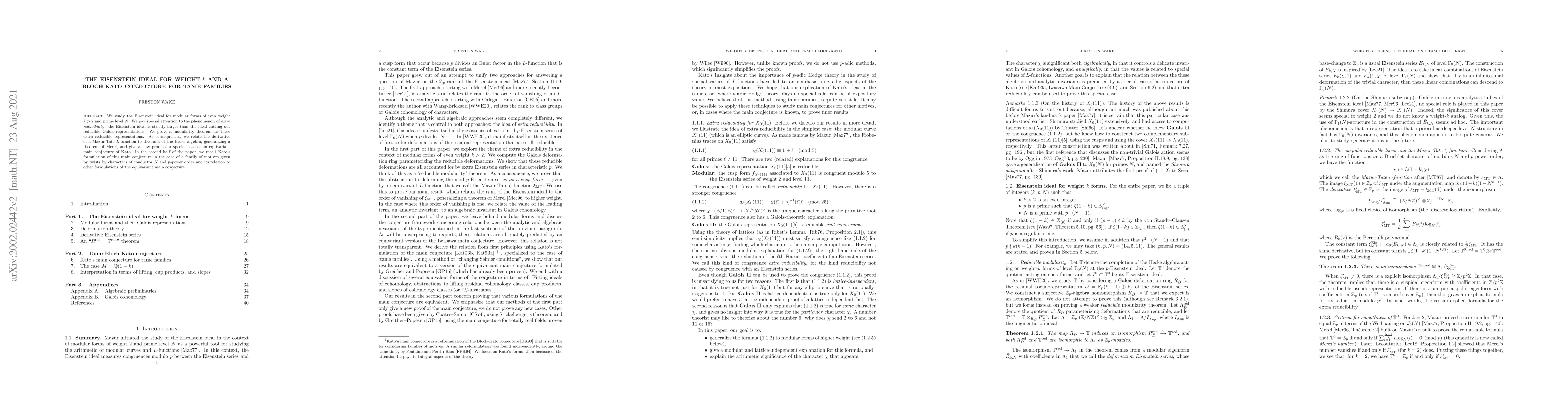 Summary: This paper investigates the Eisenstein ideal for modular forms of even weight $k>2$ and prime level $N$, focusing on "extra reducibility" phenomena. It establishes a modularity theorem for these representations and proves a relation between the derivative of a Mazur-Tate $L$-function and the rank of the Hecke algebra. The paper also explores Kato's conjecture for tame families of motives.