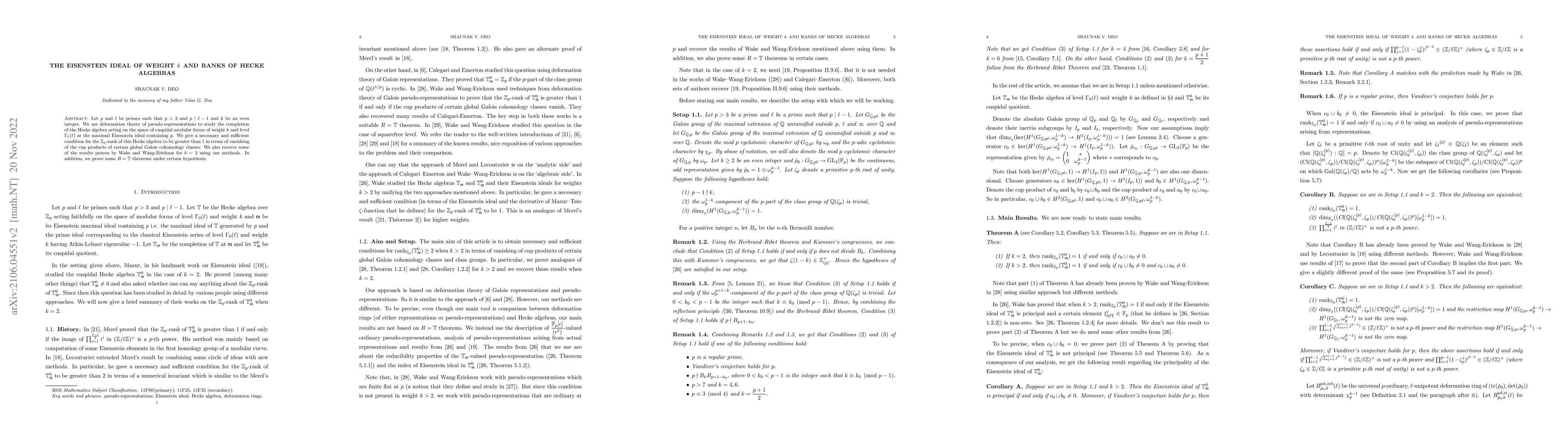 This paper explores the $\mathbb{Z}_p$-rank of Hecke algebras via the Eisenstein ideal, using deformation theory for pseudo-representations. It provides a condition for the rank to exceed $1$ based on the vanishing of specific Galois cohomology classes, extending previous results for $k=2$ and proving $R=\mathbb{T}$ theorems under certain conditions.