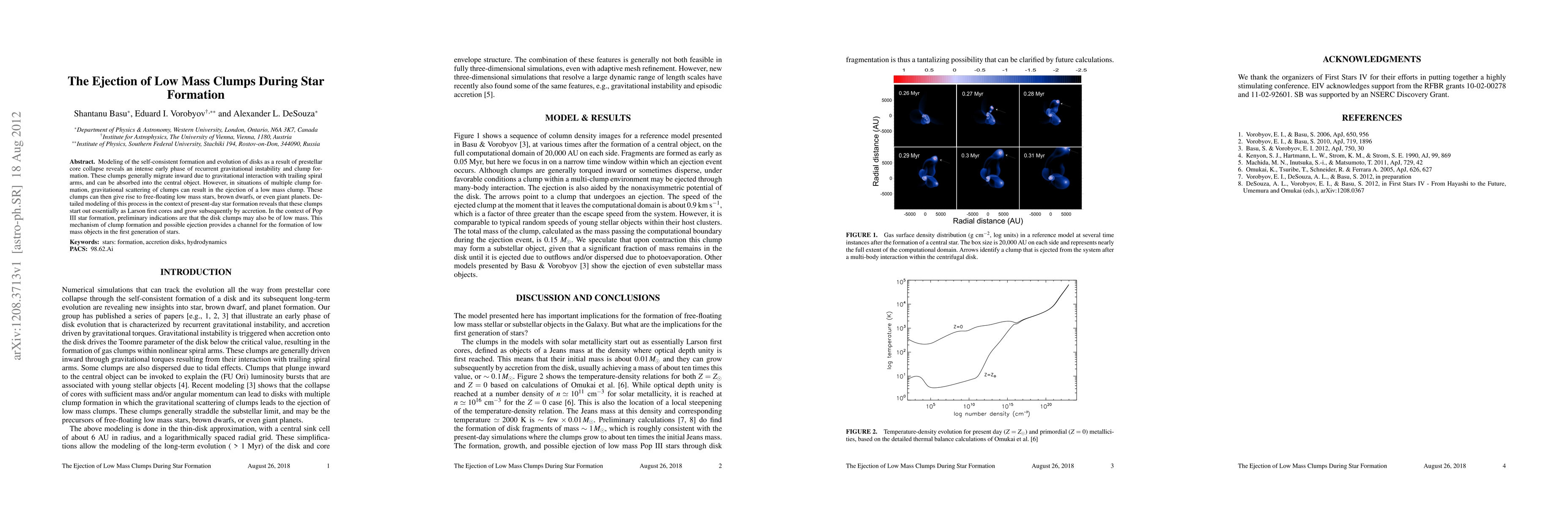 Modeling of the self-consistent formation and evolution of disks as a result of prestellar core collapse reveals an intense early phase of recurrent gravitational instability and clump formation. These clumps generally migrate inward due to gravitational interaction with trailing spiral arms, and can be absorbed into the central object. However, in situations of multiple clump formation, gravitational scattering of clumps can result in the ejection of a low mass clump. These clumps can then give rise to free-floating low mass stars, brown dwarfs, or even giant planets. Detailed modeling of this process in the context of present-day star formation reveals that these clumps start out essentially as Larson first cores and grow subsequently by accretion. In the context of Pop III star formation, preliminary indications are that the disk clumps may also be of low mass. This mechanism of clump formation and possible ejection provides a channel for the formation of low mass objects in the first generation of stars.