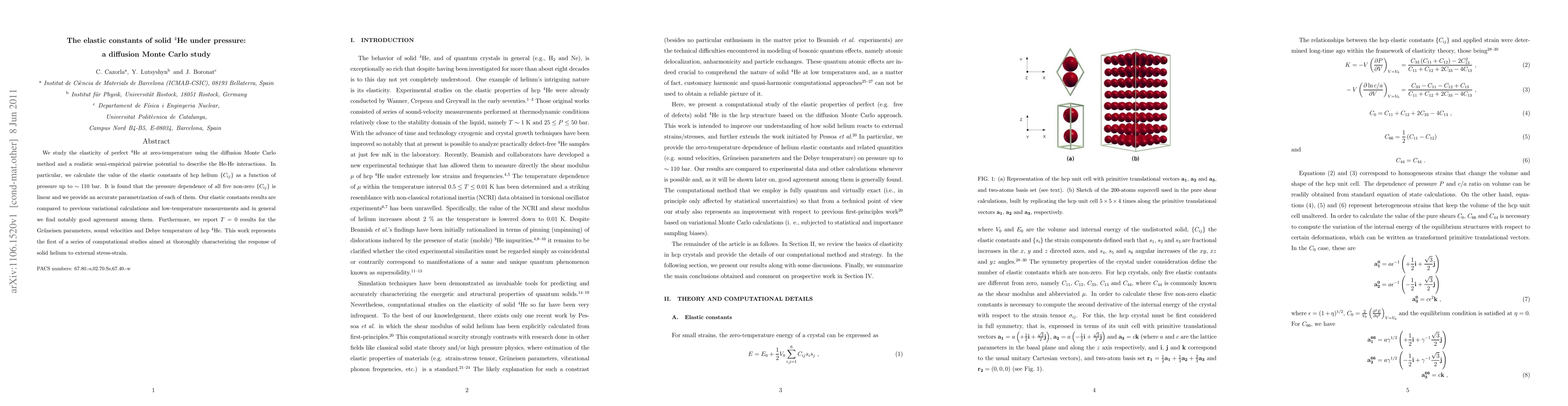 This study uses the diffusion Monte Carlo method to calculate the elastic constants of solid 4He under pressure, finding linear pressure dependence for all non-zero constants. The results show good agreement with previous calculations and measurements, and provide detailed parameters for the Gruneisen parameters, sound velocities, and Debye temperature.