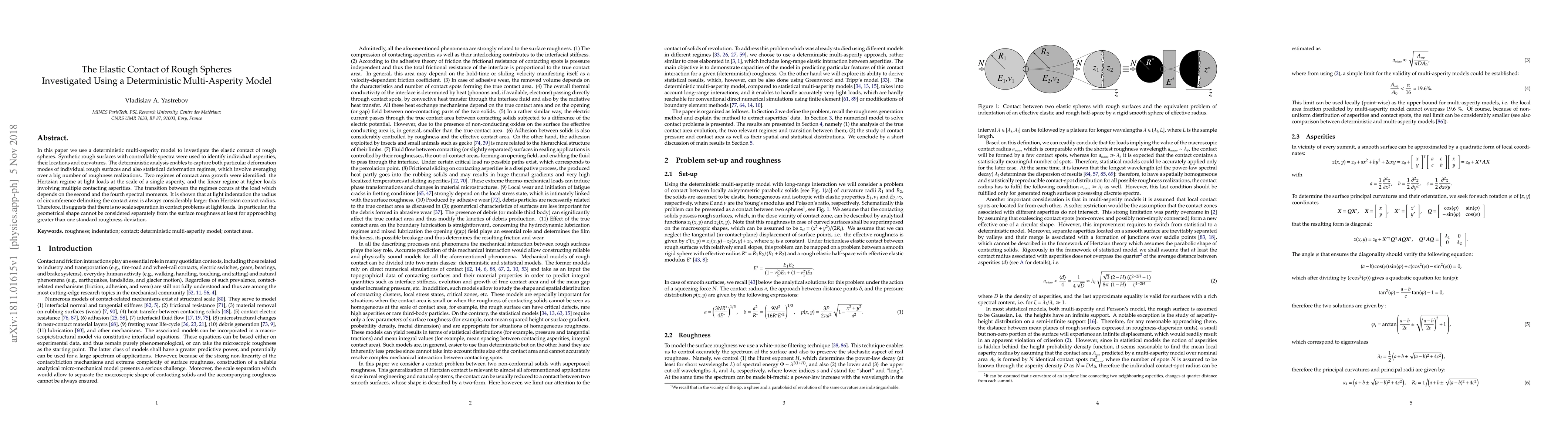 Researchers investigated the elastic contact of rough spheres using a multi-asperity model, identifying two regimes of contact area growth: Hertzian at light loads and linear at higher loads, with a transition point dependent on spectral moments. The study suggests that surface roughness cannot be separated from geometry at low loads.