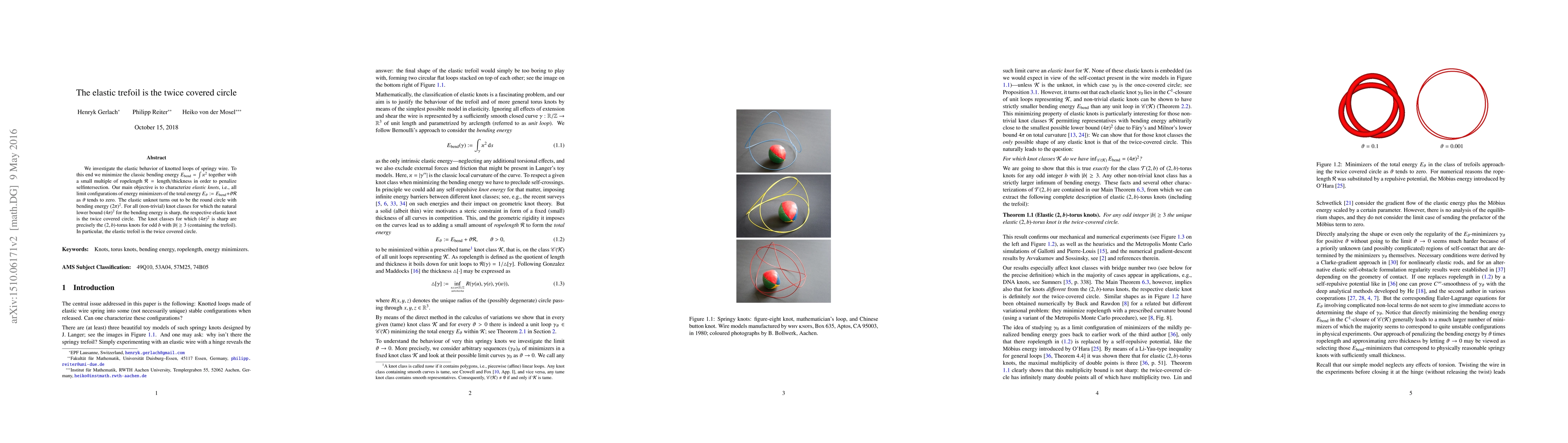 We investigate the elastic behavior of knotted loops of springy wire. To this end we minimize the classic bending energy $E_{\text{bend}}=\int\kappa^2$ together with a small multiple of ropelength $\mathcal R=\text{length}/\text{thickness}$ in order to penalize selfintersection. Our main objective is to characterize elastic knots, i.e., all limit configurations of energy minimizers of the total energy $E_\vartheta:=E_{\text{bend}}+\vartheta\mathcal R$ as $\vartheta$ tends to zero. The elastic unknot turns out to be the round circle with bending energy $(2\pi)^2$. For all (non-trivial) knot classes for which the natural lower bound $(4\pi)^2$ for the bending energy is sharp, the respective elastic knot is the twice covered circle. The knot classes for which $(4\pi)^2$ is sharp are precisely the $(2,b)$-torus knots for odd $b$ with $|b|\ge 3$ (containing the trefoil). In particular, the elastic trefoil is the twice covered circle.