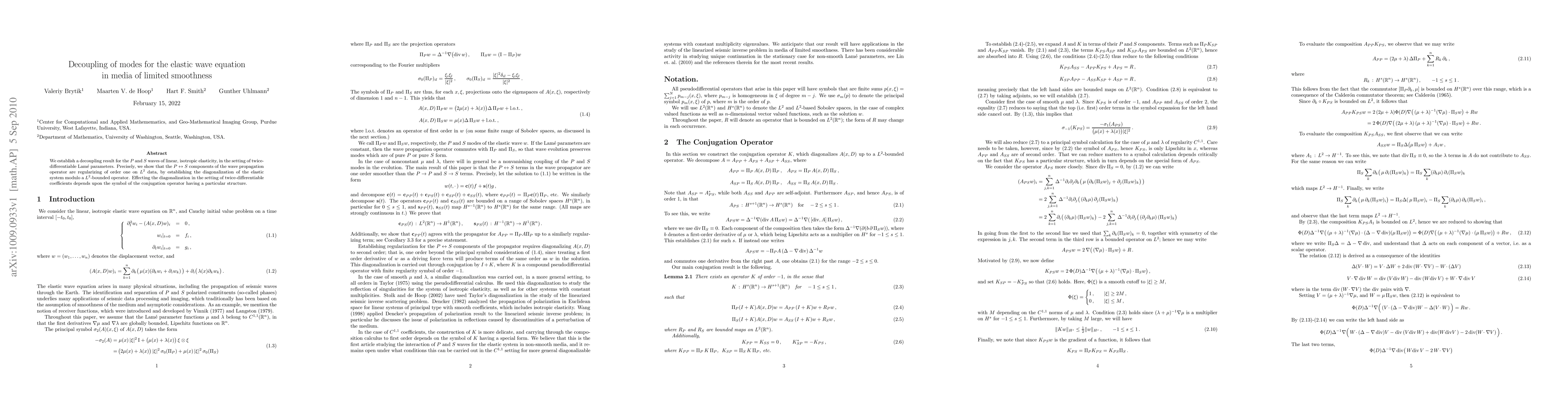 We establish a decoupling result for the $P$ and $S$ waves of linear, isotropic elasticity, in the setting of twice-differentiable Lam\'e parameters. Precisely, we show that the $P\leftrightarrow S$ components of the wave propagation operator are regularizing of order one on $L^2$ data, by establishing the diagonalization of the elastic system modulo a $L^2$-bounded operator. Effecting the diagonalization in the setting of twice-differentiable coefficients depends upon the symbol of the conjugation operator having a particular structure.