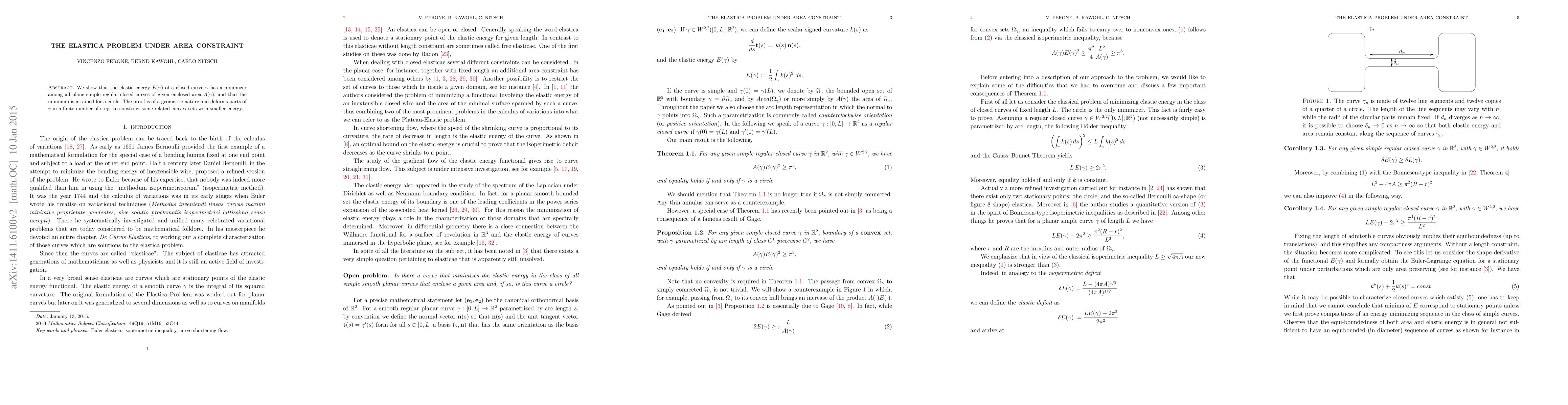 We show that the elastic energy $E(\gamma)$ of a closed curve $\gamma$ has a minimizer among all plane simple regular closed curves of given enclosed area $A(\gamma)$, and that the minimum is attained for a circle. The proof is of a geometric nature and deforms parts of $\gamma$ in a finite number of steps to construct some related convex sets with smaller energy.