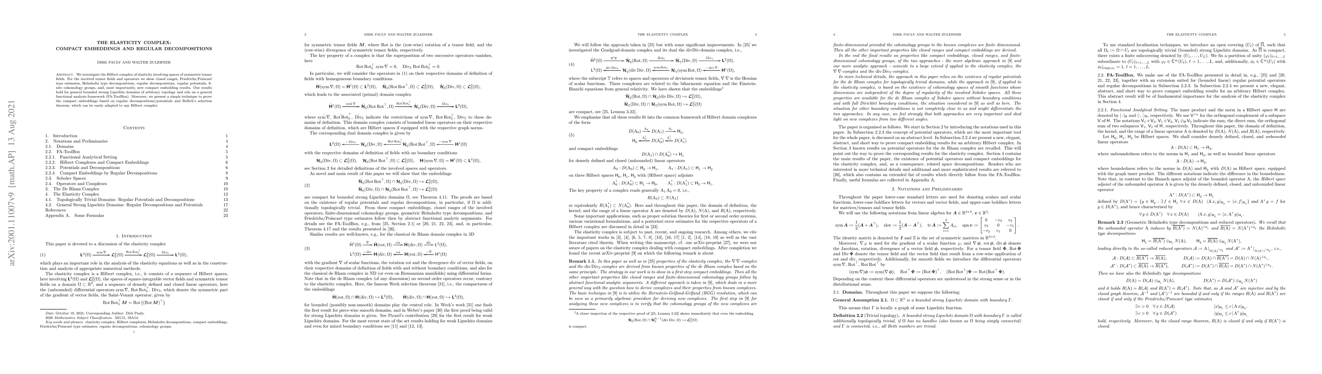 This paper explores the Hilbert complex of elasticity, demonstrating closed ranges, Friedrichs/Poincare estimates, and new compact embedding results for symmetric tensor fields in bounded strong Lipschitz domains. A novel technique based on regular decompositions and Rellich's section theorem is presented to prove these embeddings.