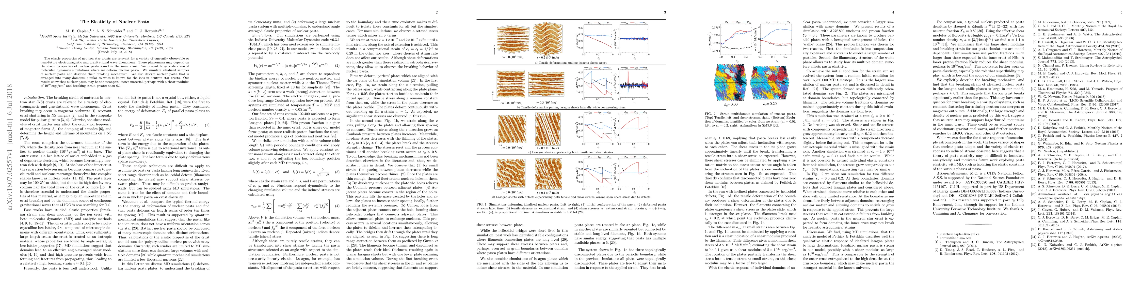 This paper investigates the elastic properties of nuclear pasta in neutron star crusts through large-scale molecular dynamics simulations. The findings suggest that nuclear pasta could be the strongest material known, with a shear modulus of $10^{30}\,\text{ergs/cm}^3$ and a breaking strain greater than 0.1.