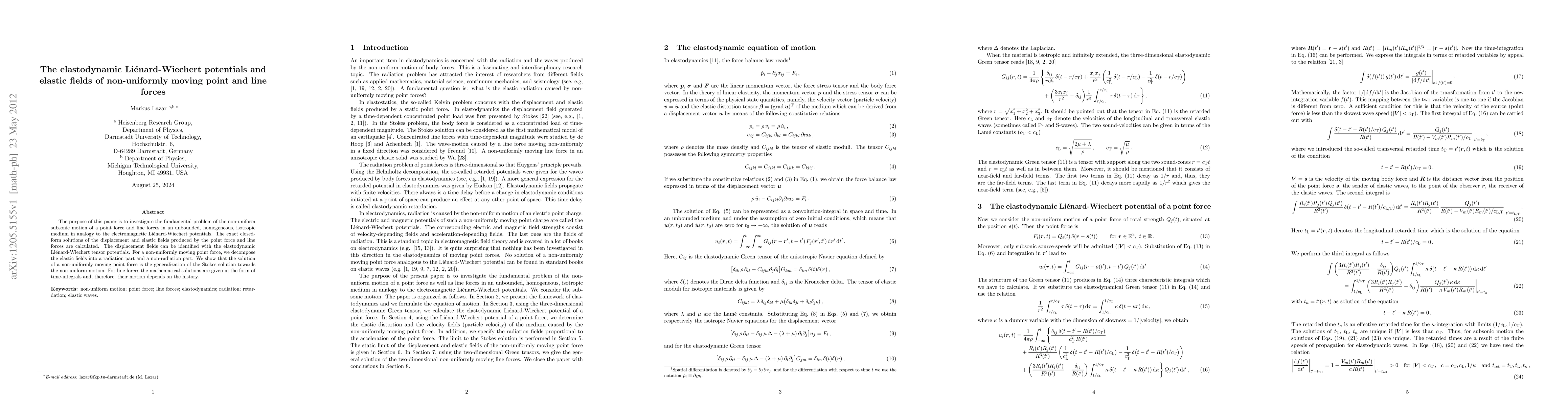 This paper investigates the elastodynamic Li\'enard-Wiechert potentials for non-uniformly moving point and line forces in an elastic medium. It provides exact closed-form solutions for the displacement and elastic fields, showing that the solution for a non-uniformly moving point force generalizes the Stokes solution.