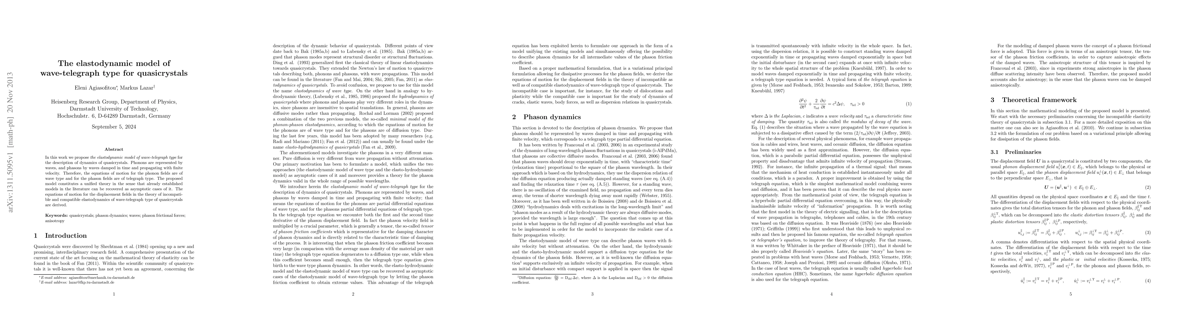 Researchers propose a unified model for quasicrystals that combines phonons (wave-like particles) with phasons (damped waves), representing both types of lattice vibrations in a single theory. The model recovers established models as asymptotic cases and provides equations of motion for displacement fields.