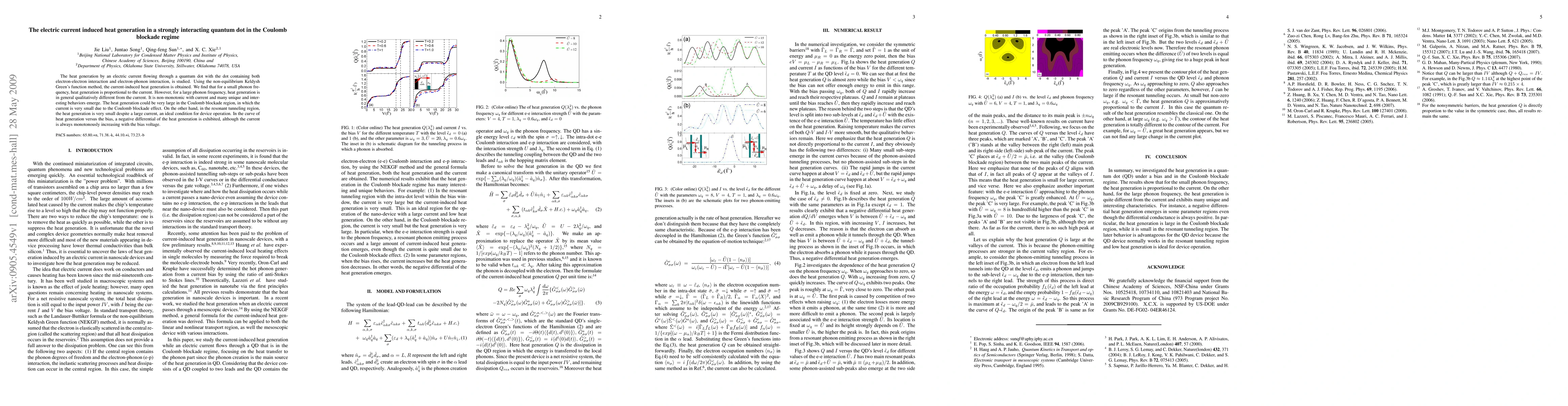 This study investigates heat generation in a quantum dot under electric current, focusing on the interplay between electron-electron and electron-phonon interactions. For small phonon frequencies, heat generation is proportional to current, but for large frequencies, it becomes non-monotonic and exhibits unique behaviors, especially in the Coulomb blockade regime where heat generation is significant despite low current.