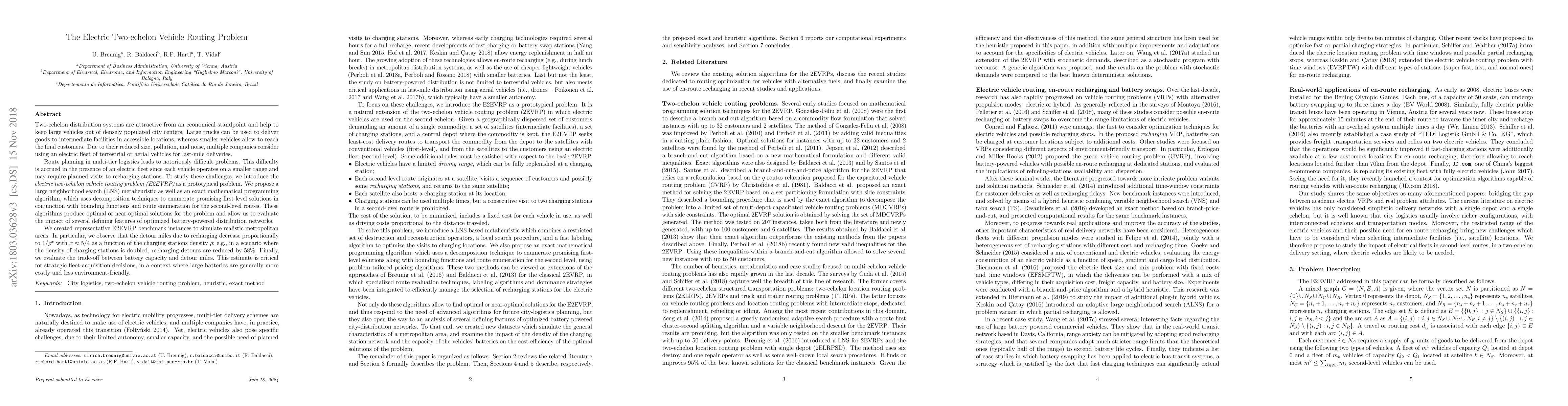A combination of exact methods and metaheuristics were used to solve the multi-echelon electric vehicle routing problem.