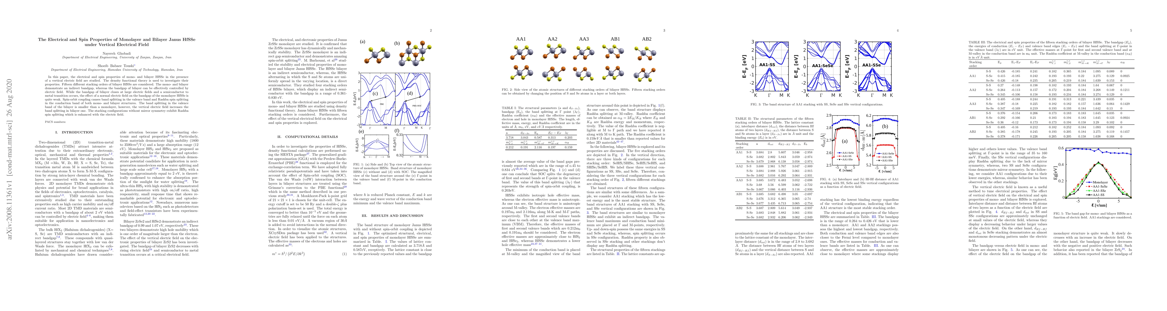 In this paper, the electrical and spin properties of mono- and bilayer HfSSe in the presence of a vertical electric field are studied. The density functional theory is used to investigate their properties. Fifteen different stacking orders of bilayer HfSSe are considered. The mono- and bilayer demonstrate an indirect bandgap, whereas the bandgap of bilayer can be effectively controlled by electric field. While the bandgap of bilayer closes at large electric fields and a semiconductor to metal transition occurs, the effect of a normal electric field on the bandgap of the monolayer HfSSe is quite weak. Spin-orbit coupling causes band splitting in the valence band and Rashba spin splitting in the conduction band of both mono- and bilayer structures. The band splitting in the valence band of the bilayer is smaller than a monolayer, however, the vertical electric field increases the band splitting in bilayer one. The stacking configurations without mirror symmetry exhibit Rashba spin splitting which is enhanced with the electric field.