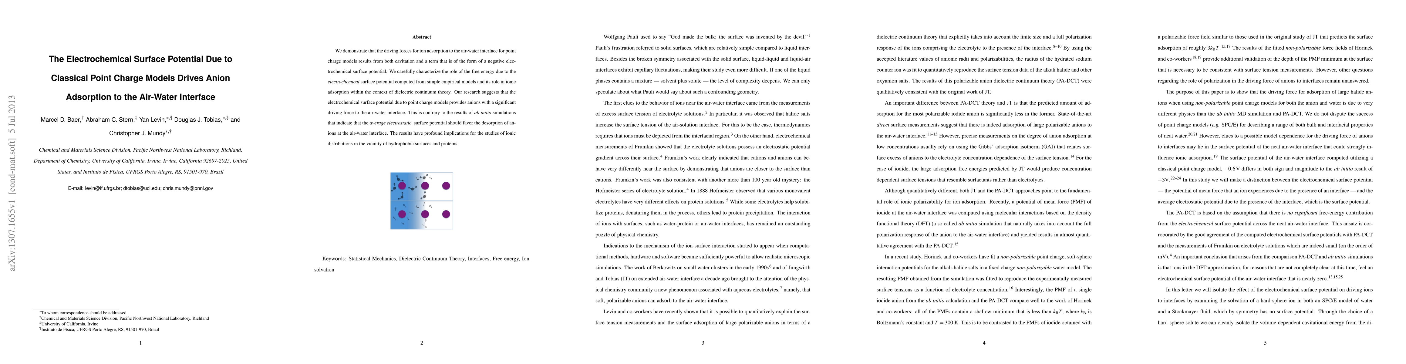 This paper explores how electrochemical surface potential from classical point charge models drives anion adsorption at the air-water interface, contrary to ab initio simulations. The study highlights the importance of this potential in influencing ionic distributions near hydrophobic surfaces and proteins.