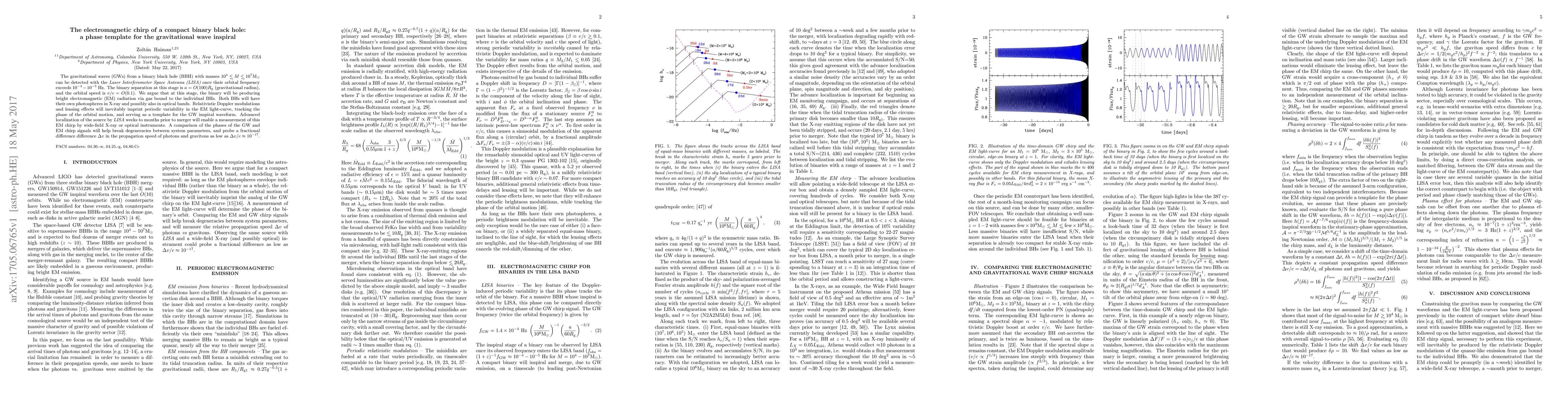 The gravitational waves (GWs) from a binary black hole (BBH) with masses between 10^4 and 10^7 Msun can be detected with the Laser Interferometer Space Antenna (LISA) once their orbital frequency exceeds 10^-4 - 10^-5 Hz. The binary separation at this stage is approximately a=100 R_g (gravitational radius), and the orbital speed is of order v/c=0.1. We argue that at this stage, the binary will be producing bright electromagnetic (EM) radiation via gas bound to the individual BHs. Both BHs will have their own photospheres in X-ray and possibly also in optical bands. Relativistic Doppler modulations and lensing effects will inevitably imprint periodic variability in the EM light-curve, tracking the phase of the orbital motion, and serving as a template for the GW inspiral waveform. Advanced localization of the source by LISA weeks to months prior to merger will enable a measurement of this EM chirp by wide-field X-ray or optical instruments. A comparison of the phases of the GW and EM chirp signals will help break degeneracies between system parameters, and probe a fractional difference difference Delta v in the propagation speed of photons and gravitons as low as Delta v/c = O(10^-17).