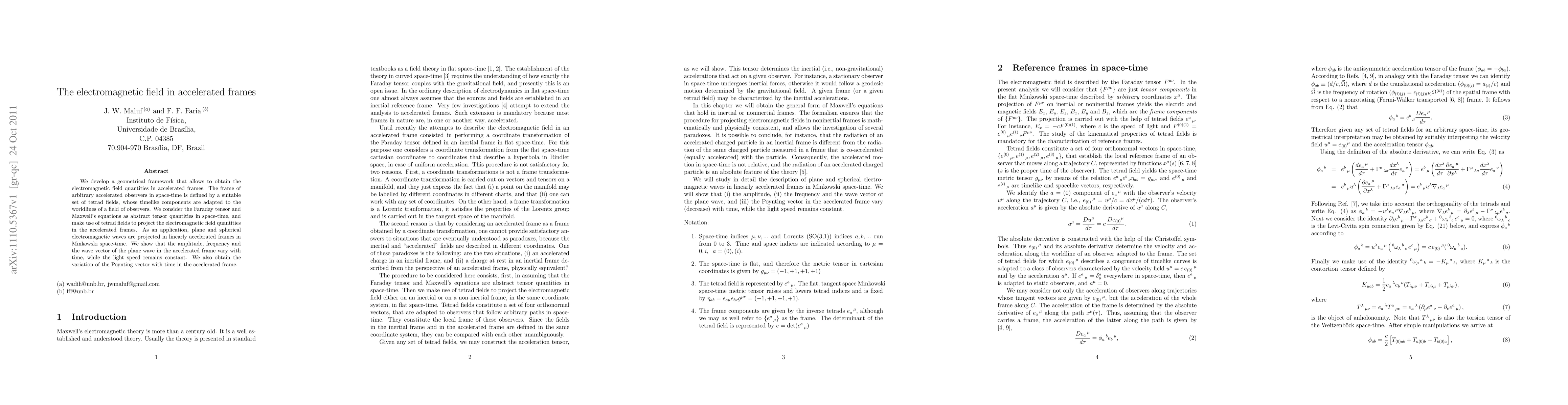 We develop a geometrical framework that allows to obtain the electromagnetic field quantities in accelerated frames. The frame of arbitrary accelerated observers in space-time is defined by a suitable set of tetrad fields, whose timelike components are adapted to the worldlines of a field of observers. We consider the Faraday tensor and Maxwell's equations as abstract tensor quantities in space-time, and make use of tetrad fields to project the electromagnetic field quantities in the accelerated frames. As an application, plane and spherical electromagnetic waves are projected in linearly accelerated frames in Minkowski space-time. We show that the amplitude, frequency and the wave vector of the plane wave in the accelerated frame vary with time, while the light speed remains constant. We also obtain the variation of the Poynting vector with time in the accelerated frame.