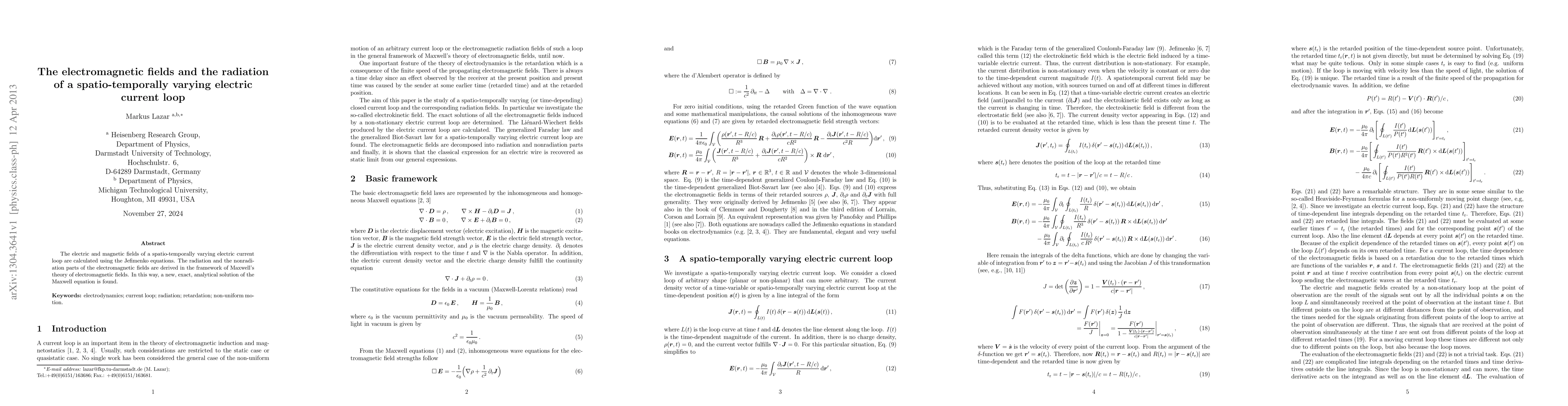 This paper calculates the electromagnetic fields of a spatio-temporally varying electric current loop using Jefimenko equations, distinguishing between radiation and nonradiation components within Maxwell's theory, and presents a new exact analytical solution to the Maxwell equations.