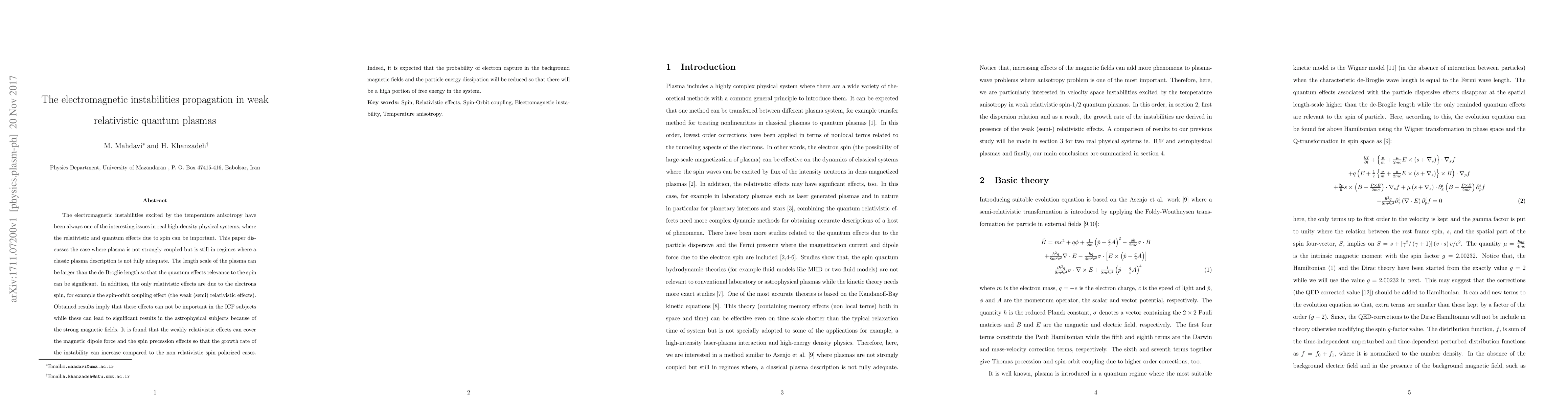 The electromagnetic instabilities excited by the temperature anisotropy have been always one of the interesting issues in real high-density physical systems, where the relativistic and quantum effects due to spin can be important. This paper discusses the case where plasma is not strongly coupled but is still in regimes where a classic plasma description is not fully adequate. The length scale of the plasma can be larger than the de-Broglie length so that the quantum effects relevance to the spin can be significant. In addition, the only relativistic effects are due to the electrons spin, for example the spin-orbit coupling effect (the weak (semi) relativistic effects). Obtained results imply that these effects can not be important in the ICF subjects while these can lead to significant results in the astrophysical subjects because of the strong magnetic fields. It is found that the weakly relativistic effects can cover the magnetic dipole force and the spin precession effects so that the growth rate of the instability can increase compared to the non relativistic spin polarized cases. Indeed, it is expected that the probability of electron capture in the background magnetic fields and the particle energy dissipation will be reduced so that there will be a high portion of free energy in the system.