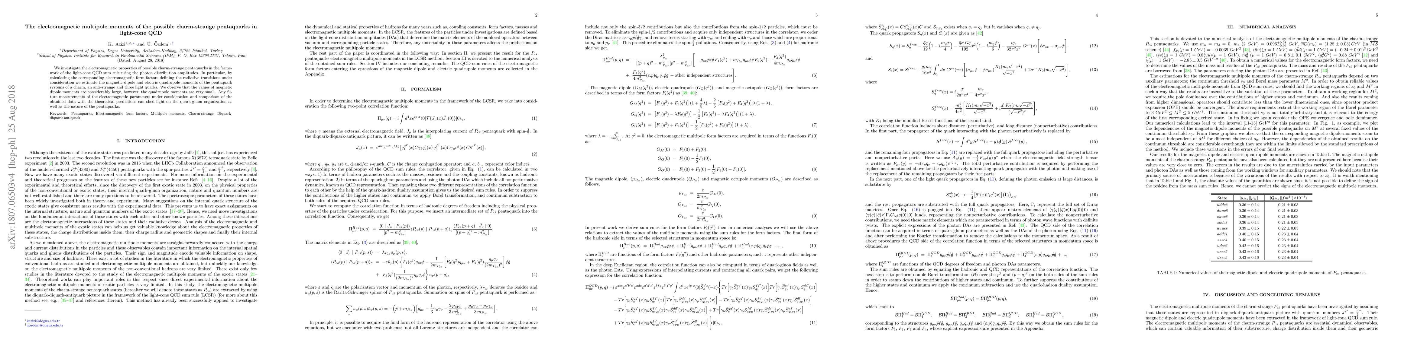 We investigate the electromagnetic properties of possible charm-strange pentaquarks in the framework of the light-cone QCD sum rule using the photon distribution amplitudes. In particular, by calculating the corresponding electromagnetic form factors defining the radiative transitions under consideration we estimate the magnetic dipole and electric quadrupole moments of the pentaquark systems of a charm, an anti-strange and three light quarks. We observe that the values of magnetic dipole moments are considerably large, however, the quadrupole moments are very small. Any future measurements of the electromagnetic parameters under consideration and comparison of the obtained data with the theoretical predictions can shed light on the quark-gluon organization as well as the nature of the pentaquarks.