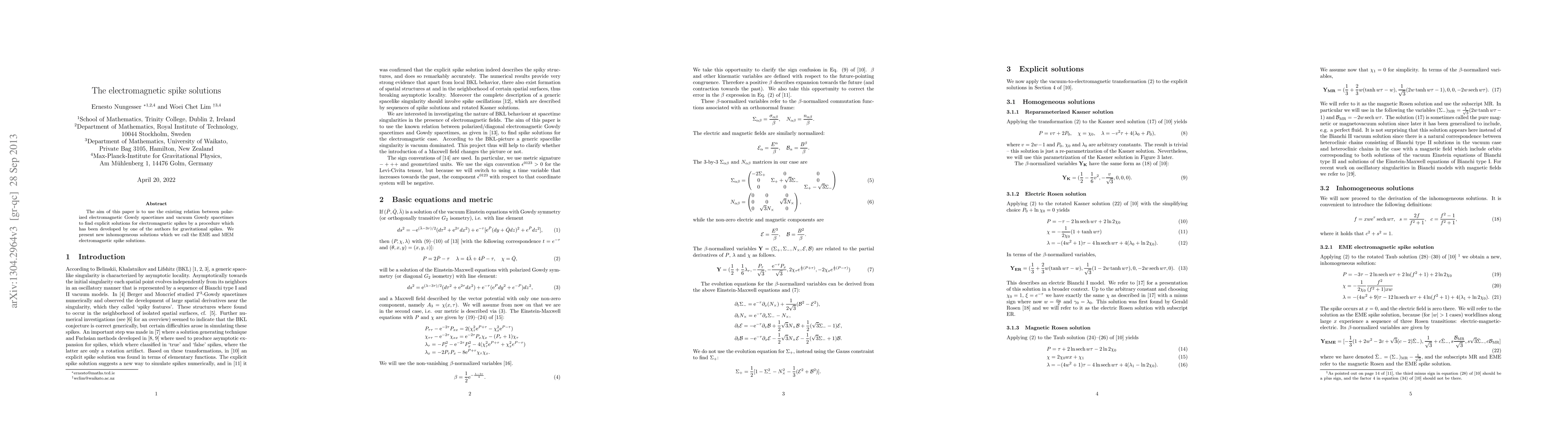 The aim of this paper is to use the existing relation between polarized electromagnetic Gowdy spacetimes and vacuum Gowdy spacetimes to find explicit solutions for electromagnetic spikes by a procedure which has been developed by one of the authors for gravitational spikes. We present new inhomogeneous solutions which we call the EME and MEM electromagnetic spike solutions.