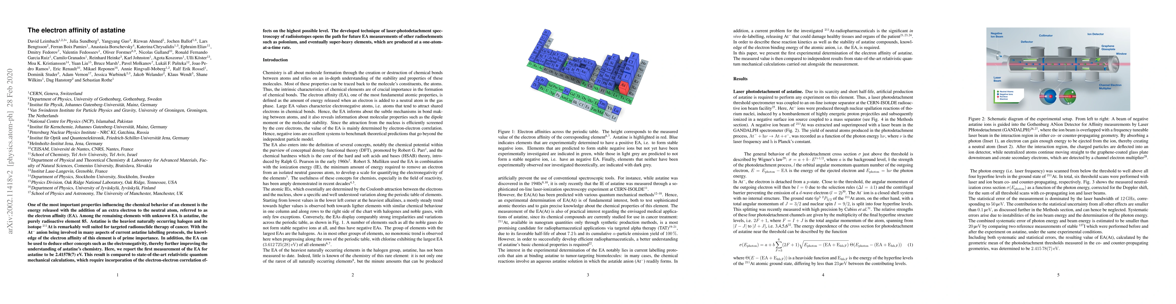 The electron affinity of astatine was measured using laser-photodetachment spectroscopy of radioisotopes, specifically 211At. The experiment was supported by state-of-the-art relativistic quantum mechanical calculations that included electron-electron correlation effects.