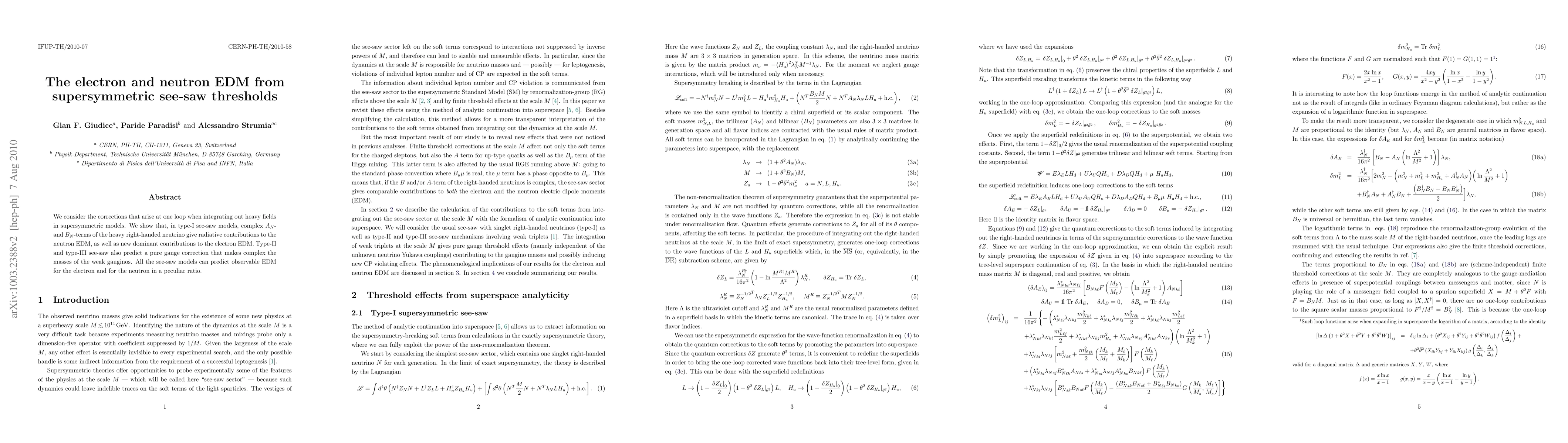 This paper investigates one-loop corrections in supersymmetric models, revealing that type-I see-saw mechanisms lead to significant radiative contributions to the neutron and electron electric dipole moments (EDM) from complex A and B terms. It also notes that type-II and type-III see-saw models predict observable EDMs in a unique ratio.
