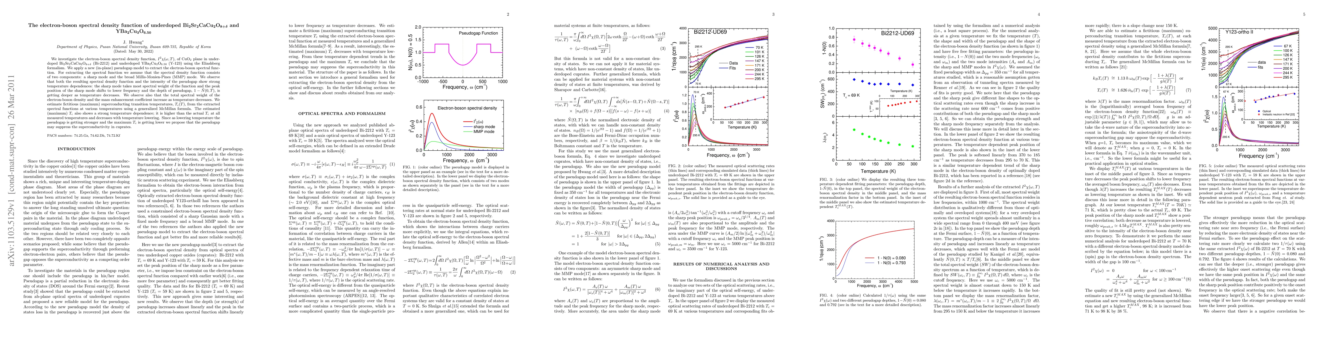 We investigate the electron-boson spectral density function, $I^2\chi(\omega,T)$, of CuO$_2$ plane in underdoped Bi$_2$Sr$_2$CaCu$_2$O$_{8+\delta}$ (Bi-2212) and underdoped YBa$_2$Cu$_3$O$_{6.50}$ (Y-123) using the Eliashberg formalism. We apply a new (in-plane) pseudogap model to extract the electron-boson spectral function. For extracting the spectral function we assume that the spectral density function consists of two components: a sharp mode and the broad Millis-Monien-Pines (MMP) mode. We observe that both the resulting spectral density function and the intensity of the pseudogap show strong temperature dependences: the sharp mode takes most spectral weight of the function and the peak position of the sharp mode shifts to lower frequency and the depth of pseudogap, $1-\tilde{N}(0,T)$, is getting deeper as temperature decreases. We observe also that the total spectral weight of the electron-boson density and the mass enhancement coefficient increase as temperature decreases. We estimate fictitious (maximum) superconducting transition temperatures, $T_c(T)$, from the extracted spectral functions at various temperatures using a generalized McMillan formula. The estimated (maximum) $T_c$ also shows a strong temperature dependence; it is higher than the actual $T_c$ at all measured temperatures and decreases with temperature lowering. Since as lowering temperature the pseudogap is getting stronger and the maximum $T_c$ is getting lower we propose that the pseudogap may suppress the superconductivity in cuprates.