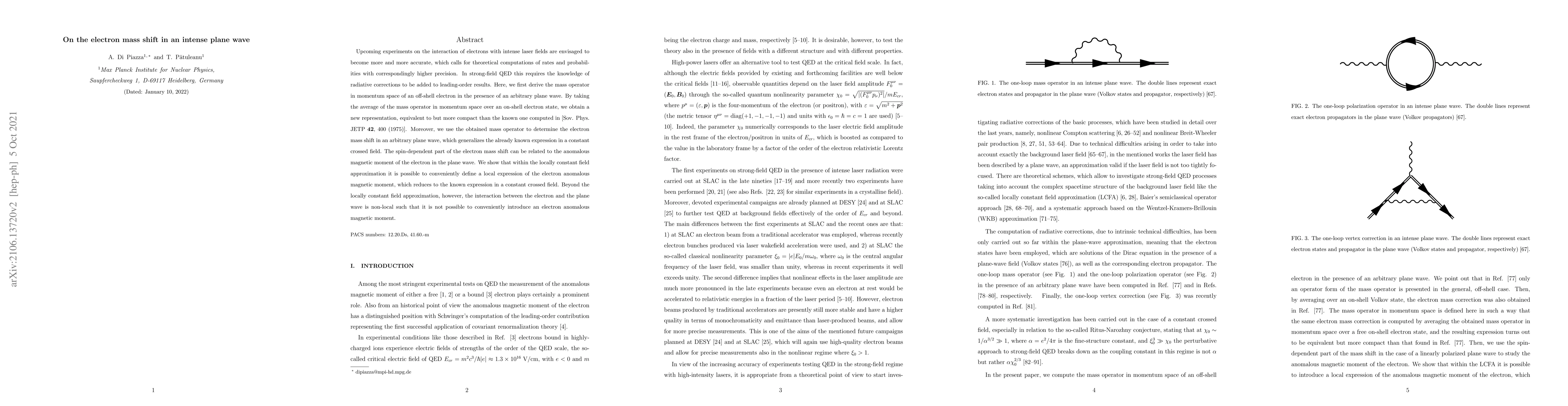 This paper derives a new mass operator for an off-shell electron in an intense plane wave, providing a more compact representation for strong-field QED calculations. It determines the electron mass shift in an arbitrary plane wave and relates the spin-dependent part to the electron's anomalous magnetic moment, showing limitations in defining such a moment beyond the locally constant field approximation.