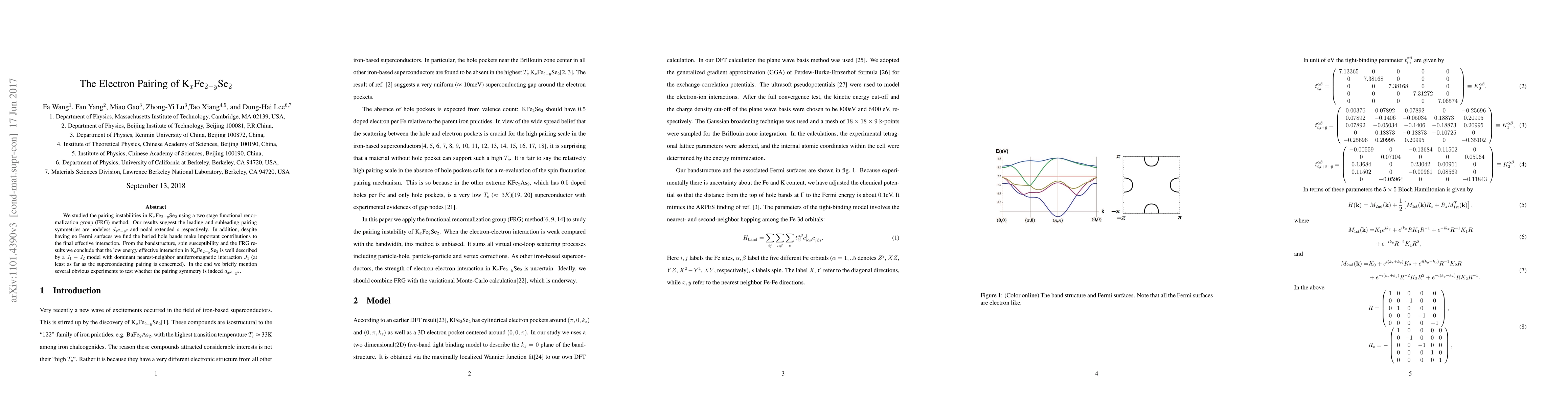 This study uses functional renormalization group to investigate pairing instabilities in K$_x$Fe$_{2-y}$Se$_2$, finding nodeless $d_{x^2-y^2}$ and nodal extended $s$ pairing symmetries. The analysis suggests that buried hole bands significantly influence the effective interaction, which is best described by a $J_1-J_2$ model with dominant $J_1$ interaction.