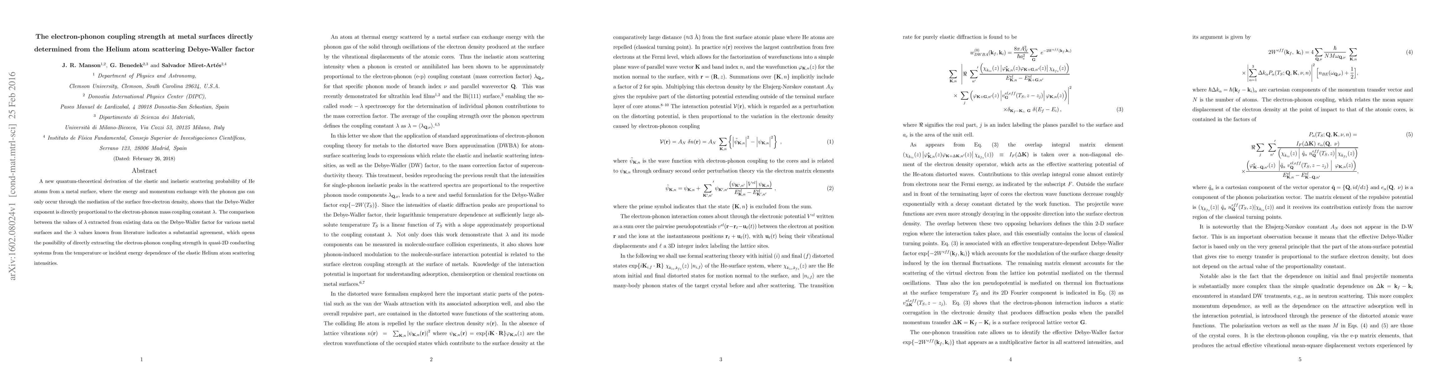 A new quantum-theoretical derivation of the elastic and inelastic scattering probability of He atoms from a metal surface, where the energy and momentum exchange with the phonon gas can only occur through the mediation of the surface free-electron density, shows that the Debye-Waller exponent is directly proportional to the electron-phonon mass coupling constant $\lambda$. The comparison between the values of $\lambda$ extracted from existing data on the Debye-Waller factor for various metal surfaces and the $\lambda$ values known from literature indicates a substantial agreement, which opens the possibility of directly extracting the electron-phonon coupling strength in quasi-2D conducting systems from the temperature or incident energy dependence of the elastic Helium atom scattering intensities.