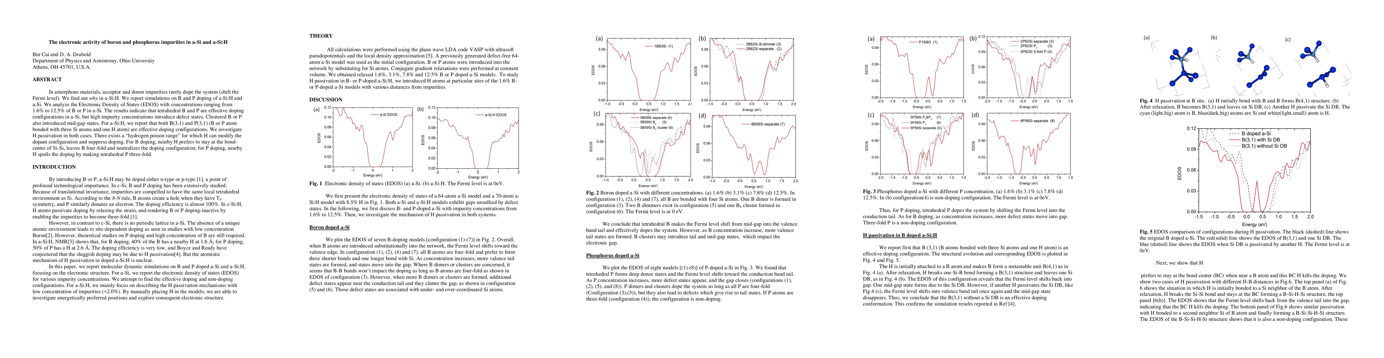 In amorphous materials, acceptor and donor impurities rarely dope the system (shift the Fermi level). We find out why in a-Si:H. We report simulations on B and P doping of a-Si:H and a-Si. We analyze the Electronic Density of States (EDOS) with concentrations ranging from 1.6% to 12.5% of B or P in a-Si. The results indicate that tetrahedral B and P are effective doping configurations in a-Si, but high impurity concentrations introduce defect states. Clustered B or P also introduced mid-gap states. For a-Si:H, we report that both B(3,1) and P(3,1) (B or P atom bonded with three Si atoms and one H atom) are effective doping configurations. We investigate H passivation in both cases. There exists a "hydrogen poison range" for which H can modify the dopant configuration and suppress doping. For B doping, nearby H prefers to stay at the bond-center of Si-Si, leaves B four-fold and neutralizes the doping configuration; for P doping, nearby H spoils the doping by making tetrahedral P three-fold.