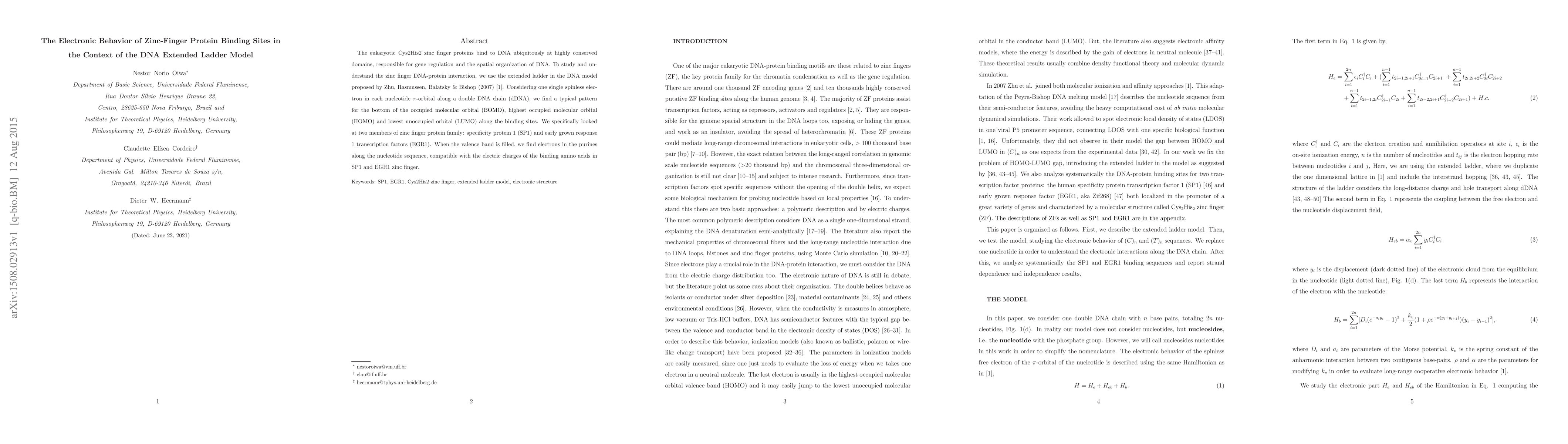 This study investigates how zinc-finger proteins bind to DNA using a modified DNA model, finding specific patterns in molecular orbitals that match the amino acids involved in binding. The research provides insights into gene regulation and DNA-protein interaction mechanisms.